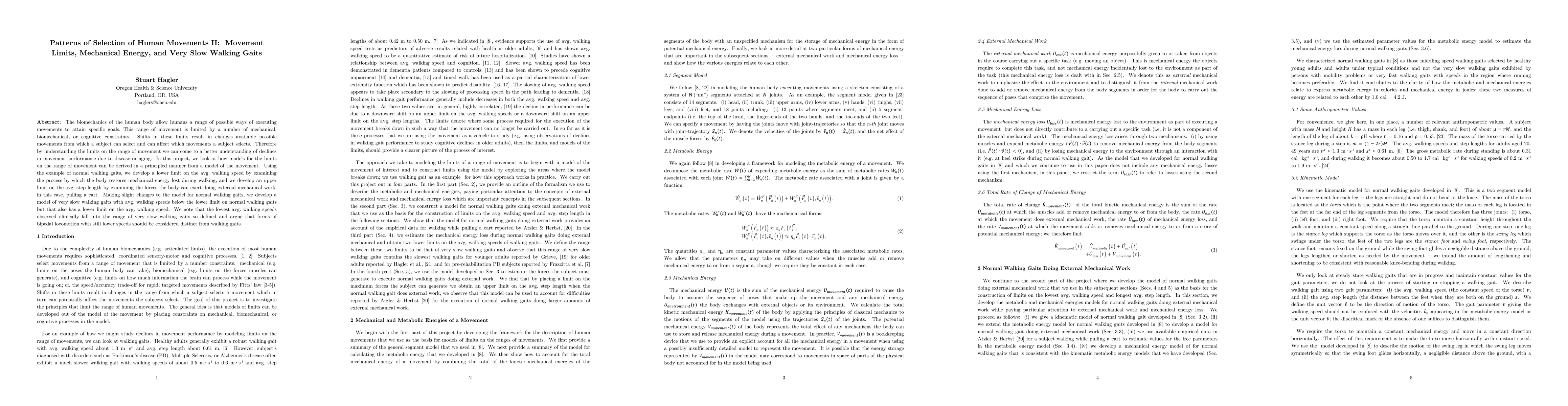 This paper explores the biomechanical constraints that limit human movement, focusing on normal and very slow walking gaits. It develops models to determine lower limits on average walking speed and step length based on mechanical energy restoration and external work forces, respectively.