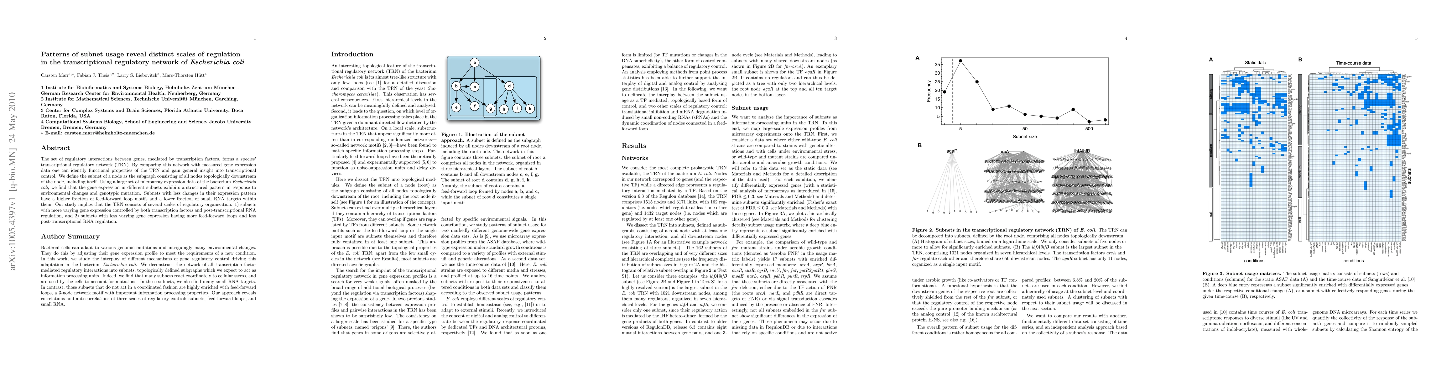 This study reveals distinct scales of regulation within the transcriptional regulatory network of Escherichia coli, showing that subnets with stable gene expression patterns contain more feed-forward loops and less post-transcriptional RNA regulation, while those with more variable expression are influenced by both transcription factors and small RNA targets.