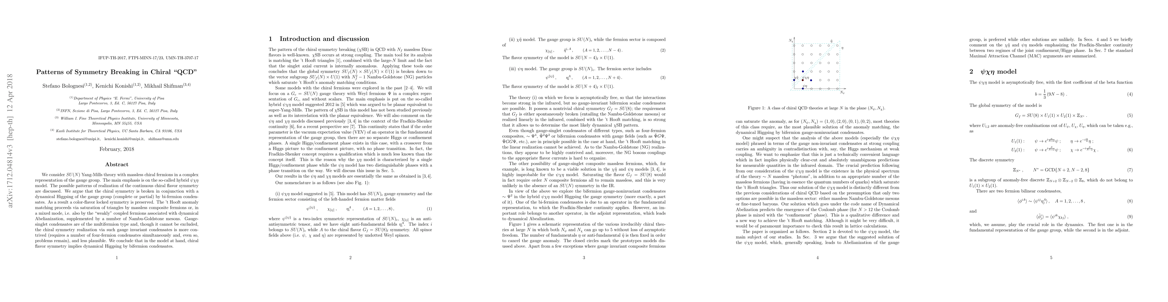 We consider $SU(N)$ Yang-Mills theory with massless chiral fermions in a complex representation of the gauge group. The main emphasis is on the so-called hybrid psi-chi-eta model. The possible patterns of realization of the continuous chiral flavor symmetry are discussed. We argue that the chiral symmetry is broken in conjunction with a dynamical Higgsing of the gauge group (complete or partial) by bi-fermion condensates. As a result a color-flavor locked symmetry is preserved. The 't Hooft anomaly matching proceeds via saturation of triangles by massless composite fermions or, in a mixed mode, i.e., also by the "weakly" coupled fermions associated with dynamical Abelianization, supplemented by a number of Nambu-Goldstone mesons. Gauge-singlet condensates are of the multifermion type and, though it cannot be excluded, the chiral symmetry realization via such gauge invariant condensates is more contrived (requires a number of four-fermion condensates simultaneously and, even so, problems remain), and less plausible. We conclude that in the model at hand, chiral flavor symmetry implies dynamical Higgsing by bifermion condensates.