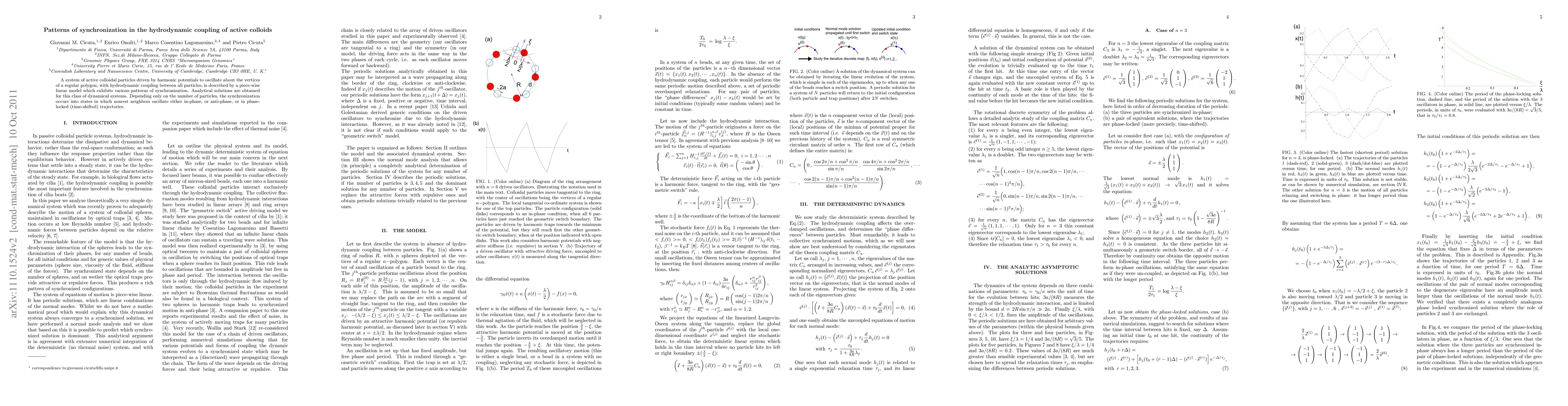 A system of active colloidal particles driven by harmonic potentials to oscillate about the vertices of a regular polygon, with hydrodynamic coupling between all particles, is described by a piece-wise linear model which exhibits various patterns of synchronization. Analytical solutions are obtained for this class of dynamical systems. Depending only on the number of particles, the synchronization occurs into states in which nearest neighbors oscillate either in-phase, or anti-phase, or in phase-locked (time-shifted) trajectories.