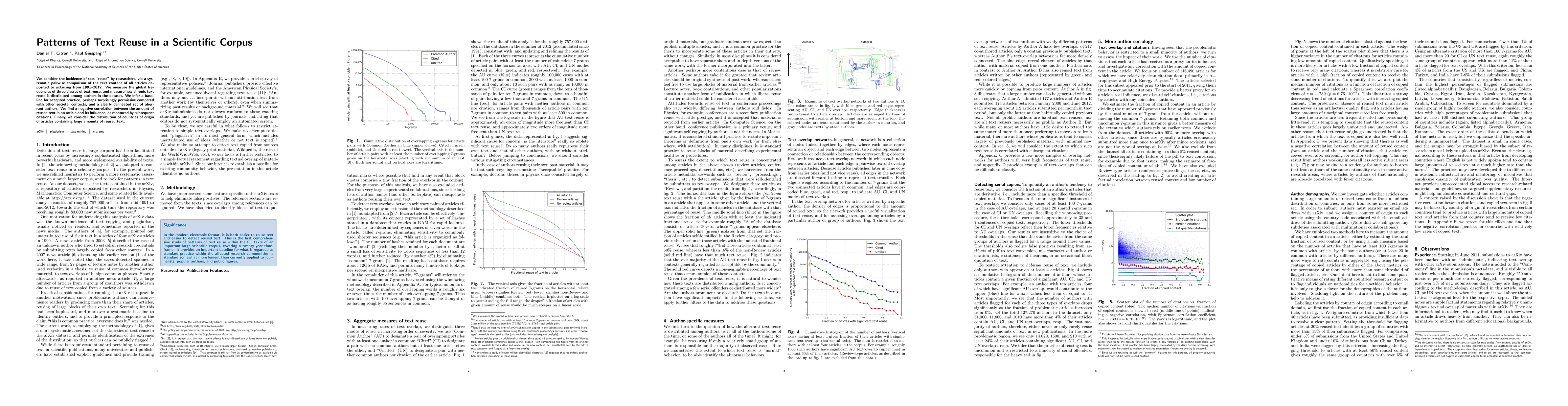 We consider the incidence of text "reuse" by researchers, via a systematic pairwise comparison of the text content of all articles deposited to arXiv.org from 1991--2012. We measure the global frequencies of three classes of text reuse, and measure how chronic text reuse is distributed among authors in the dataset. We infer a baseline for accepted practice, perhaps surprisingly permissive compared with other societal contexts, and a clearly delineated set of aberrant authors. We find a negative correlation between the amount of reused text in an article and its influence, as measured by subsequent citations. Finally, we consider the distribution of countries of origin of articles containing large amounts of reused text.