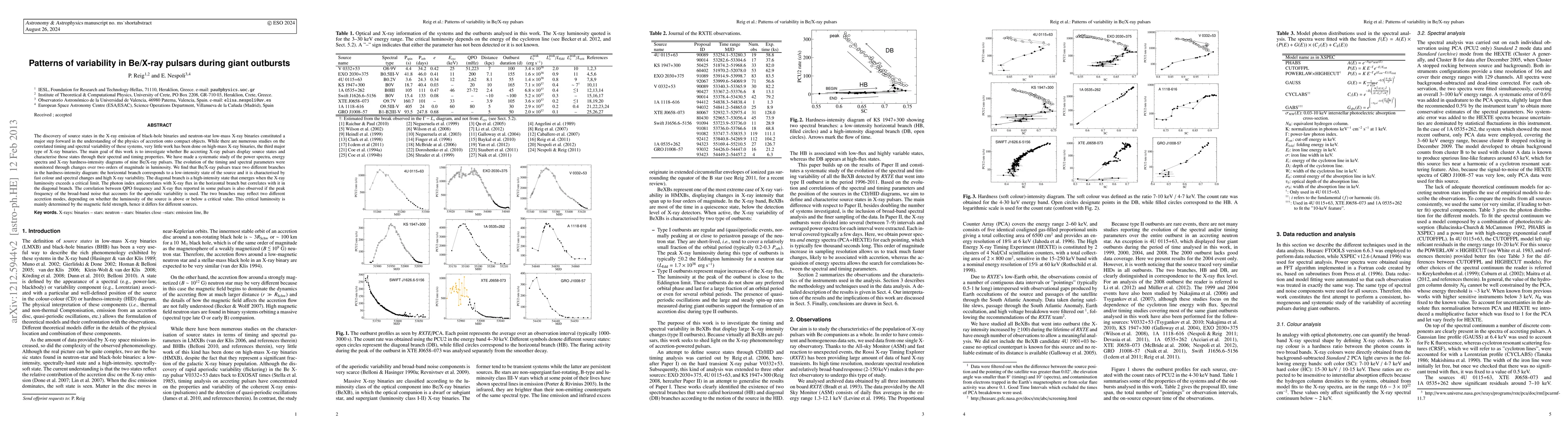 This study investigates the variability patterns in Be/X-ray pulsars during giant outbursts, finding that they exhibit two distinct branches in the hardness-intensity diagram. The horizontal branch indicates a low-intensity state with high variability, while the diagonal branch represents a high-intensity state emerging above a critical luminosity threshold, suggesting different accretion modes.