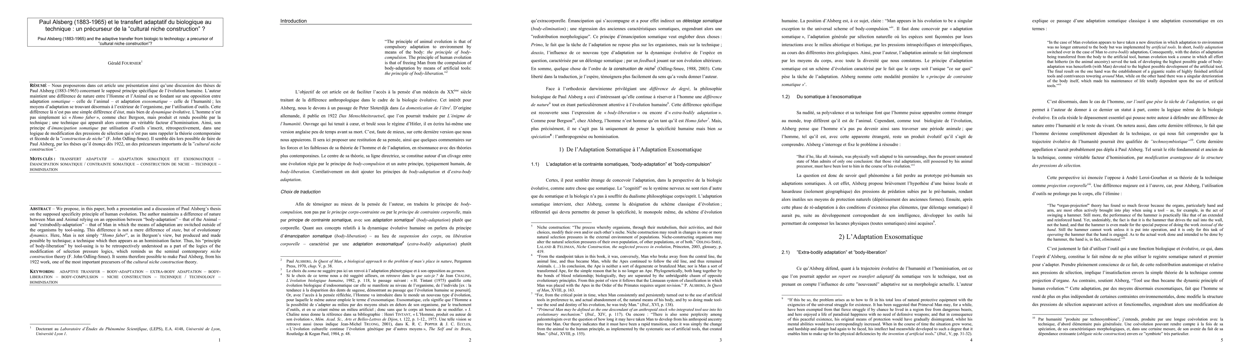 We propose, in this paper, both a presentation and a discussion of Paul Alsberg's thesis on the supposed specificity principle of human evolution. The author maintains a difference of nature between Man and Animal relying on an opposition between "body-adaptation" - that of the Animal - and "extrabodily-adaptation" - that of Man in which the means of adaptation are switched outside of the organisms by tool-using. This difference is not a mere difference of state, but of evolutionary dynamics. Here, Man is not simply "Homo faber", as in Bergson's view, but produced and made possible by technique; a technique which then appears as an hominisation factor. Thus, his "principle of body-liberation" by tool-using is to be retrospectively understood as a part of the logics of the modification of selection pressure logics, which reminds us the seminal contemporary niche construction theory (F. John Odling-Smee). It seems therefore possible to make Paul Alsberg, from his 1922 work, one of the most important precursors of the cultural niche construction theory.