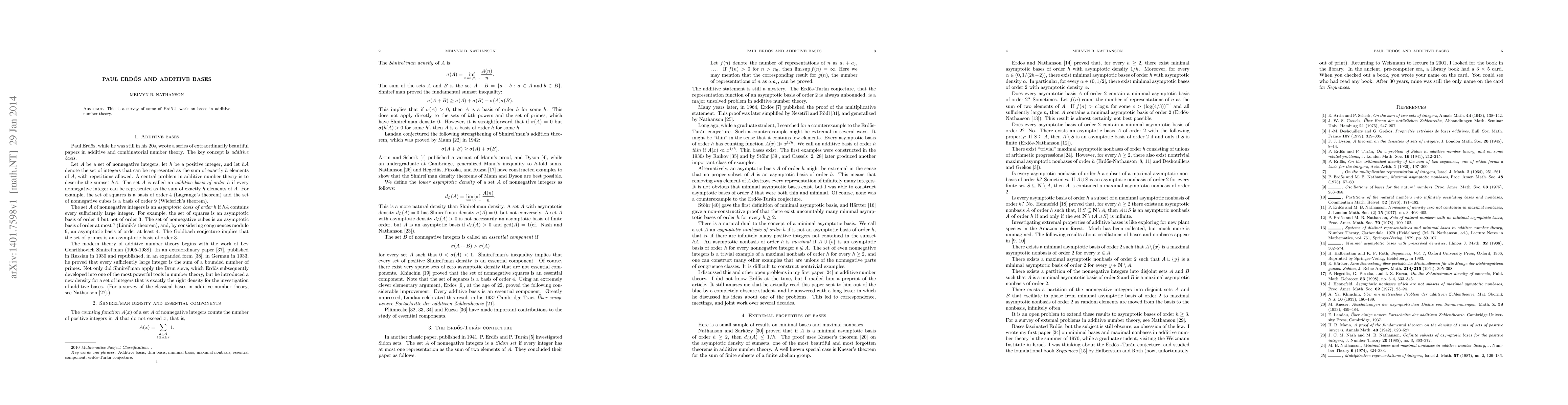 Summary: This paper surveys Paul Erdős's contributions to additive number theory, focusing on his work regarding additive bases, which are sets of integers that can generate all positive integers via addition. Erdős's insights have significantly influenced the field of additive number theory.