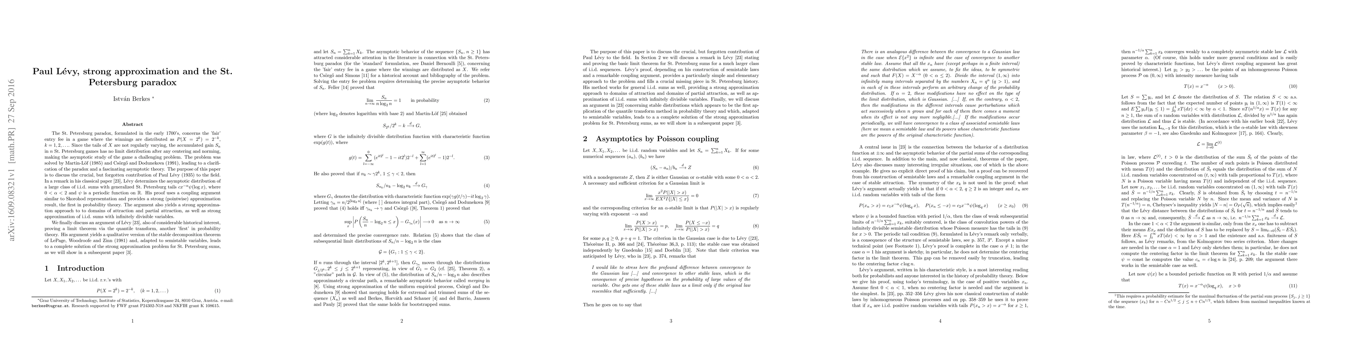 This paper discusses a forgotten remark of Paul L\'evy (1935), determining the asymptotic distribution of sums of i.i.d. random variables with tails $cx^{-\alpha}\psi(\log x)$, where $0<\alpha<2$ and $\psi$ is a periodic function on $\mathbb R$. Such sums occur in the St. Petersburg paradox and L\'evy's results precede the crucial results of Martin-L\"of (1985) and Cs\"org\H{o} and Dodunekova (1991) on the paradox by 50 years. L\'evy's proof uses a coupling argument similar to Skorohod representation and provides a strong (pointwise) approximation result, the first in probability theory. In the same paper, L\'evy also proves limit theorems for i.i.d. sums by using the quantile transform, another 'first' in the theory.