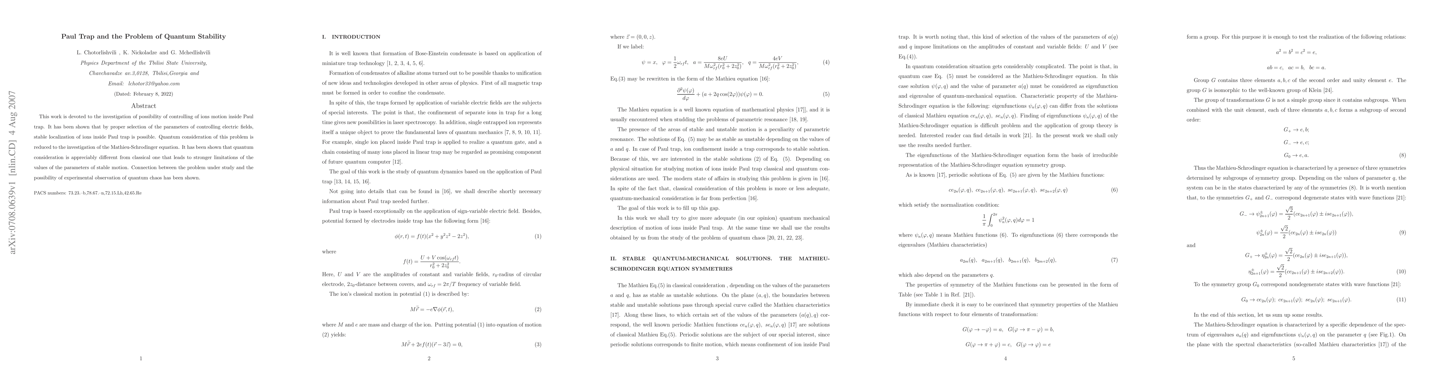This work is devoted to the investigation of possibility of controlling of ions motion inside Paul trap. It has been shown that by proper selection of the parameters of controlling electric fields, stable localization of ions inside Paul trap is possible. Quantum consideration of this problem is reduced to the investigation of the Mathieu-Schrodinger equation. It has been shown that quantum consideration is appreciably different from classical one that leads to stronger limitations of the values of the parameters of stable motion. Connection between the problem under study and the possibility of experimental observation of quantum chaos has been shown.