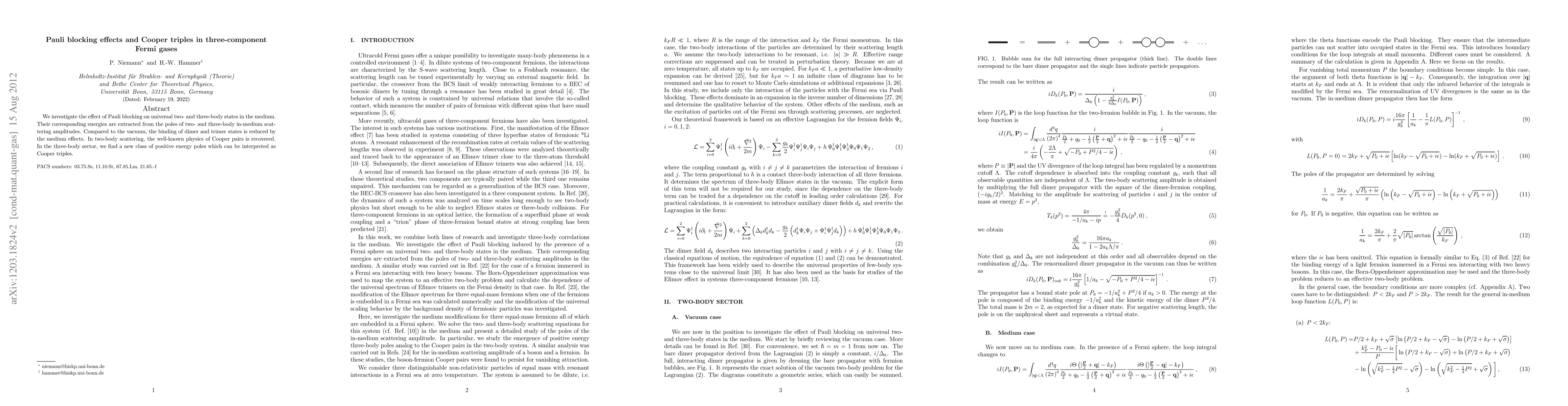 This paper examines the influence of Pauli blocking on the binding energies of two- and three-body states in three-component Fermi gases, revealing reduced binding in the medium compared to vacuum. It identifies a new class of positive energy poles in the three-body sector, interpreted as Cooper triples.