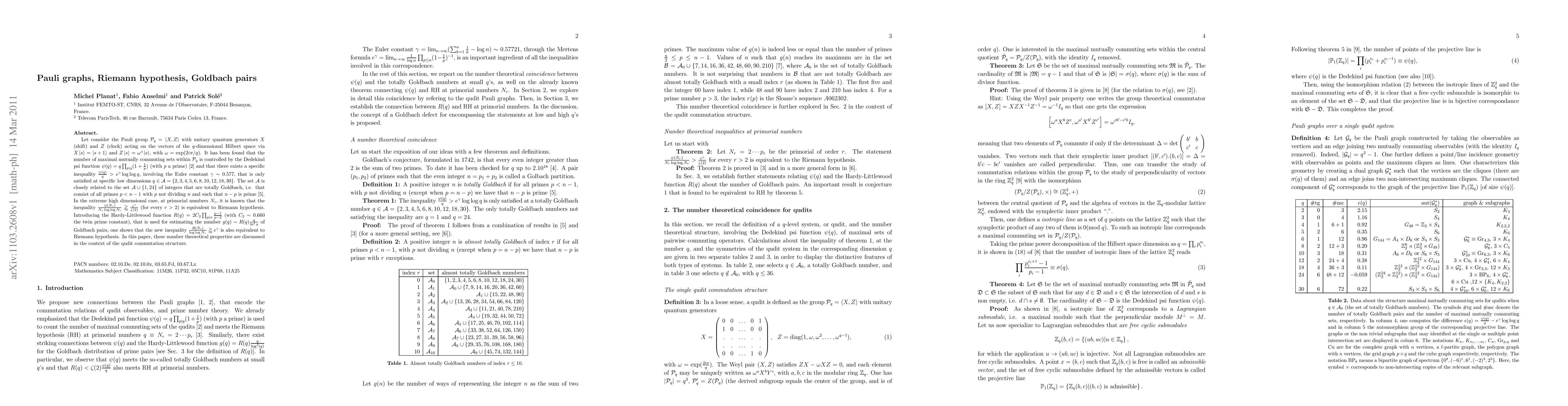 This paper explores the connection between Pauli graphs, the Riemann hypothesis, and Goldbach pairs through the study of the Pauli group's commutation structure. It finds that specific dimensions satisfying a particular inequality relate to integers that are totally Goldbach and are linked to the validity of the Riemann hypothesis.