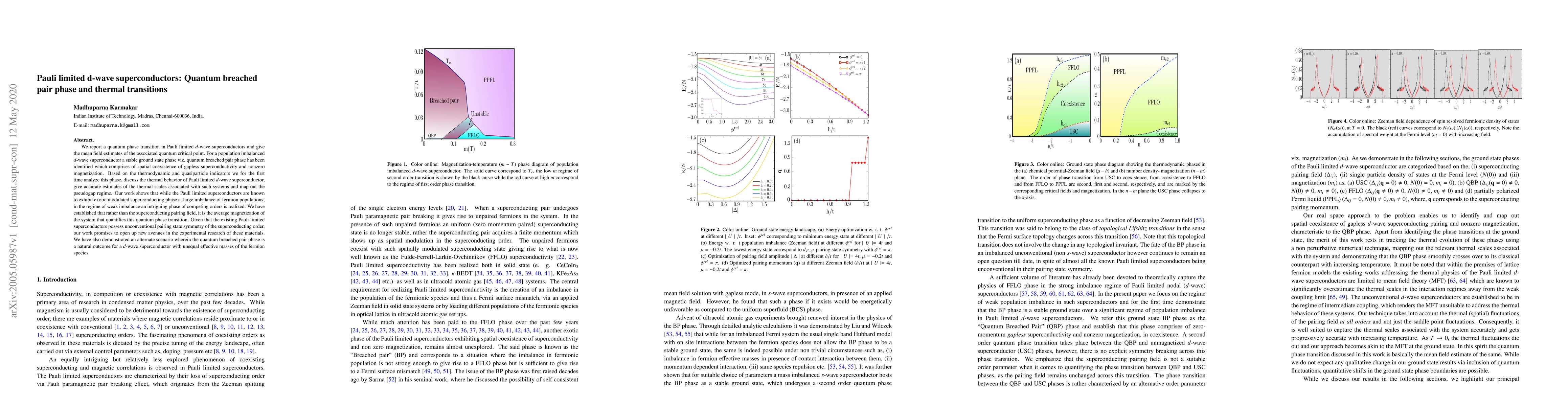 This research identifies a stable "quantum breached pair phase" in Pauli limited $d$-wave superconductors, characterized by coexisting gapless superconductivity and nonzero magnetization. It provides mean field estimates for the quantum critical point and analyzes thermal transitions, offering new insights into the competing orders and unconventional pairing states in these superconductors.