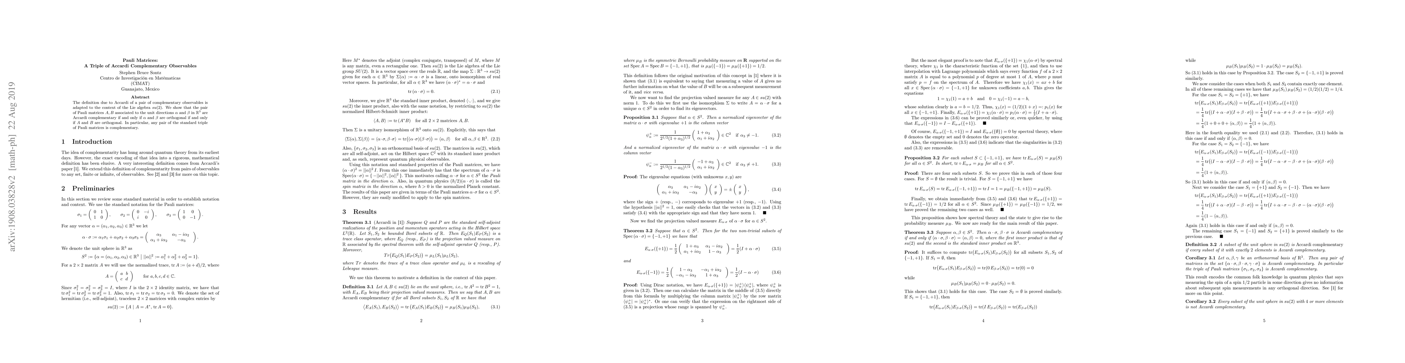 The definition due to Accardi of a pair of complementary observables is adapted to the context of the Lie algebra $ su(2) $. We show that the pair of Pauli matrices $ A,B $ associated to the unit directions $ \alpha $ and $ \beta $ in $ \mathbb{R}^{3} $ are Accardi complementary if and only if $ \alpha $ and $ \beta $ are orthogonal if and only if $ A $ and $ B $ are orthogonal. In particular, any pair of the standard triple of Pauli matrices is complementary.
