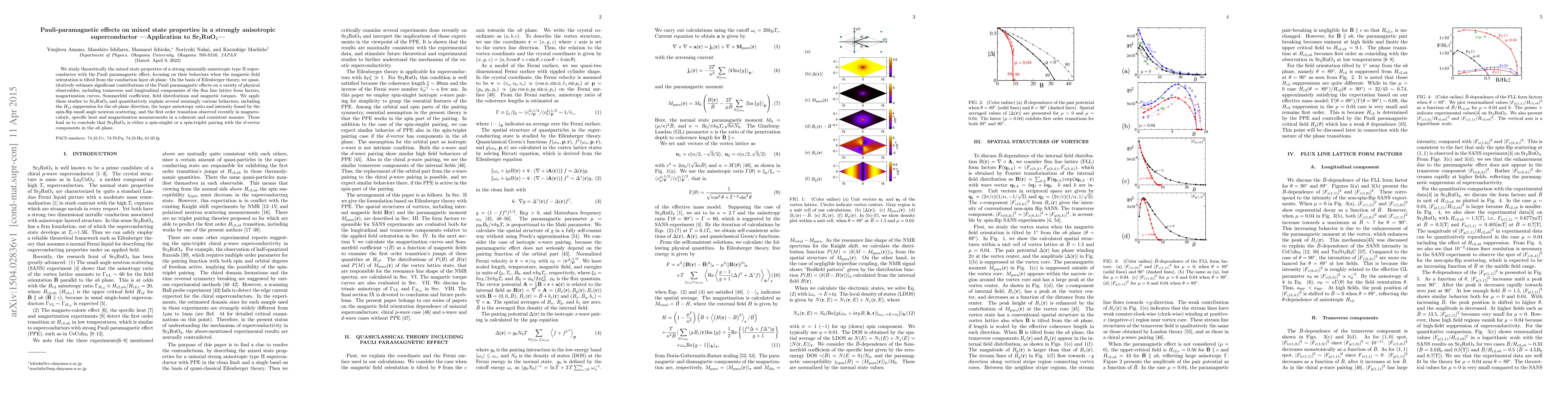 We study theoretically the mixed state properties of a strong uniaxially-anisotropic type II superconductor with the Pauli paramagnetic effect, focusing on their behaviors when the magnetic field orientation is tilted from the conduction layer ab plane. On the basis of Eilenberger theory, we quantitatively estimate significant contributions of the Pauli paramagnetic effects on a variety of physical observables, including transverse and longitudinal components of the flux line lattice form factors, magnetization curves, Sommerfeld coefficient, field distributions and magnetic torques. We apply these studies to Sr_2_RuO_4_ and quantitatively explain several seemingly curious behaviors, including the H_c2_ suppression for the ab plane direction, the larger anisotropy ratio and intensity found by the spin-flip small angle neutron scattering, and the first order transition observed recently in magneto-caloric, specific heat and magnetization measurements in a coherent and consistent manner. Those lead us to conclude that Sr_2_RuO_4_ is either a spin-singlet or a spin-triplet pairing with the d-vector components in the ab plane.