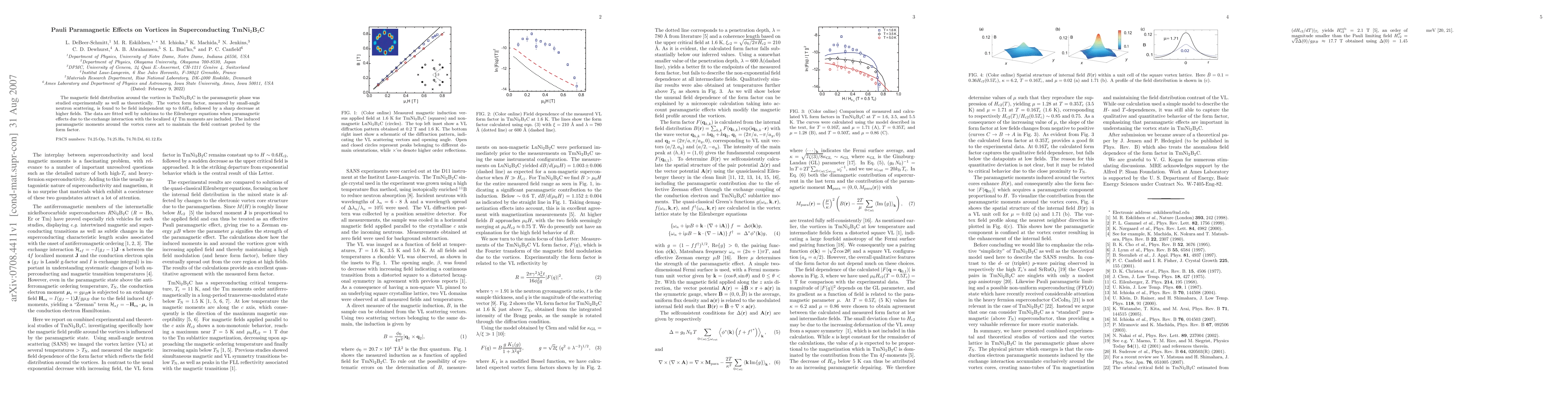 The research investigates vortices in superconducting TmNi2B2C, finding the vortex form factor, measured via small-angle neutron scattering, remains field-independent up to 0.6 Hc2 before sharply decreasing at higher fields. Theoretical solutions to the Eilenberger equations, incorporating paramagnetic effects from localized 4f Tm moments, accurately fit the experimental data, revealing induced paramagnetic moments around vortex cores that maintain field contrast.