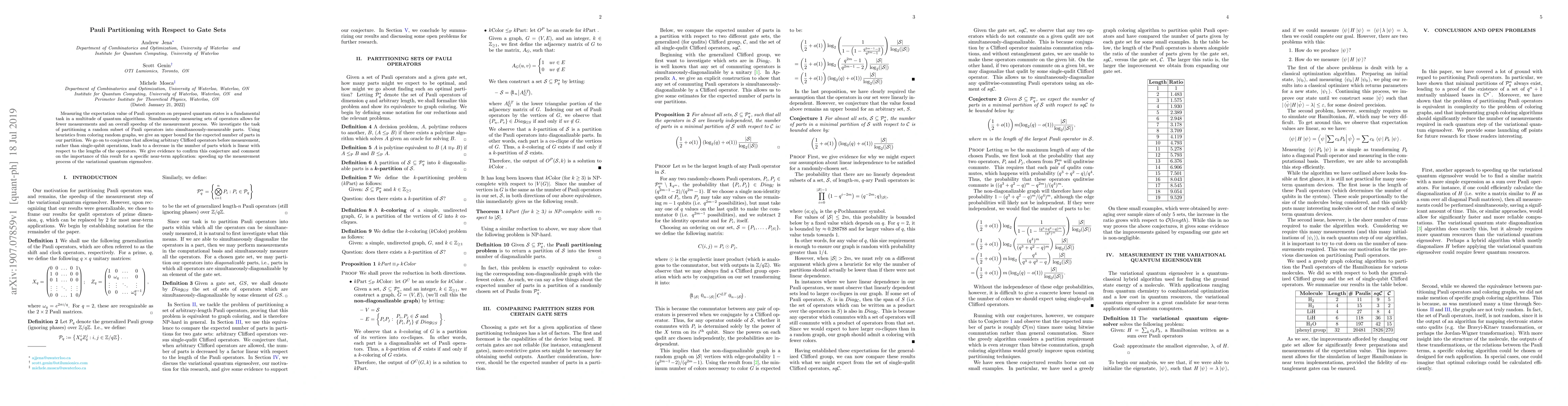 This paper explores partitioning sets of Pauli operators into simultaneously-measurable parts to speed up quantum measurements. It uses graph coloring heuristics to find an upper bound for the number of parts and conjectures that including Clifford operators reduces the number of parts linearly, which is crucial for enhancing the efficiency of variational quantum eigensolvers.