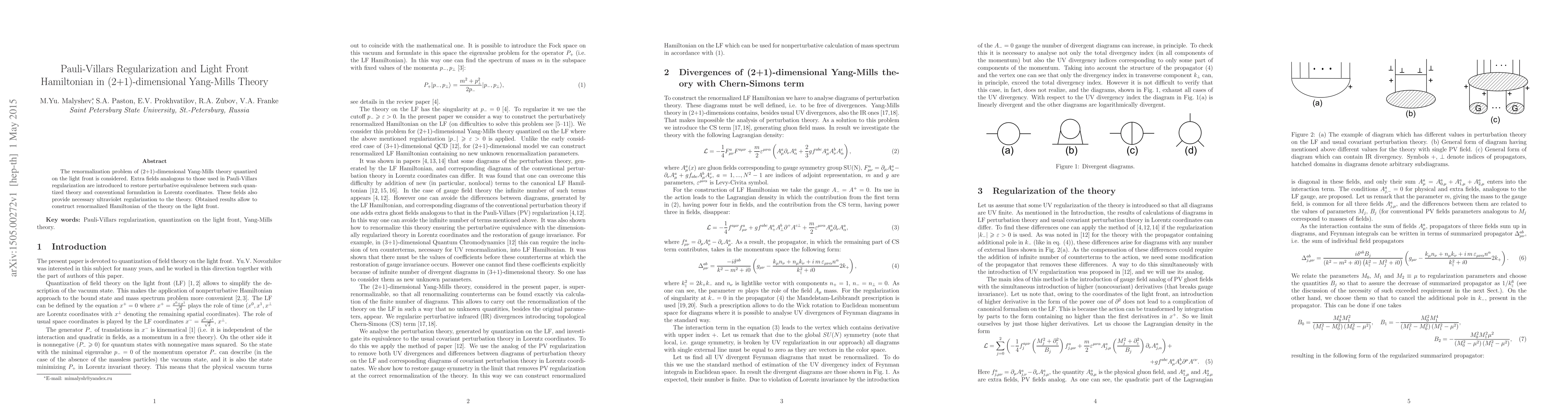 This paper introduces Pauli-Villars regularization to address the renormalization problem in (2+1)-dimensional Yang-Mills theory quantized on the light front, using extra fields to restore perturbative equivalence and provide ultraviolet regularization, ultimately leading to a renormalized light front Hamiltonian.