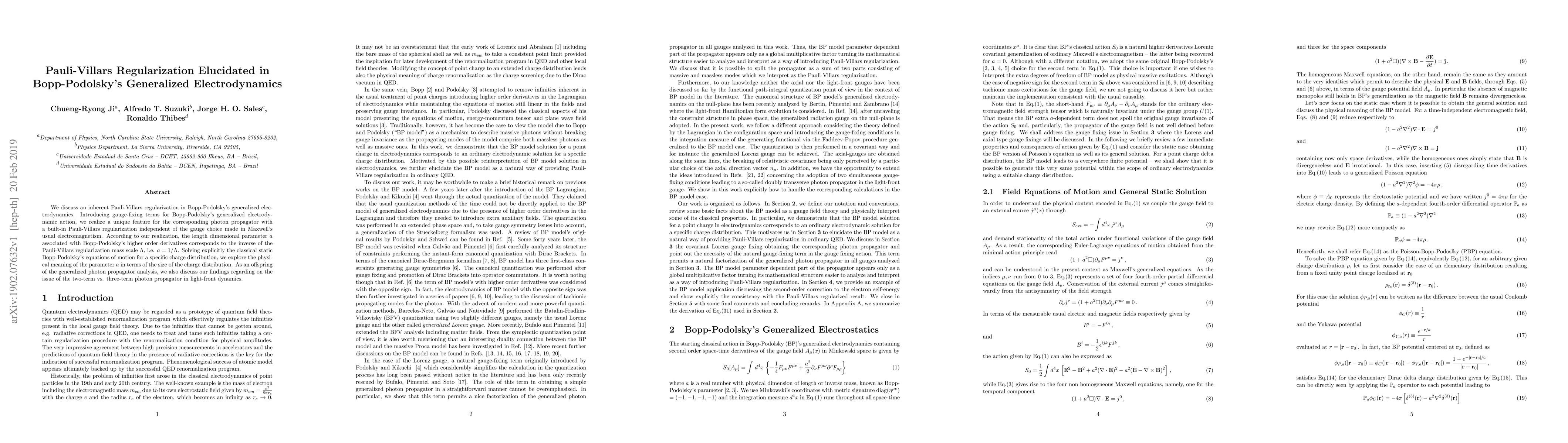 We discuss an inherent Pauli-Villars regularization in Bopp-Podolsky's generalized electrodynamics. Introducing gauge-fixing terms for Bopp-Podolsky's generalized electrodynamic action, we realize a unique feature for the corresponding photon propagator with a built-in Pauli-Villars regularization independent of the gauge choice made in Maxwell's usual electromagnetism. According to our realization, the length dimensional parameter $a$ associated with Bopp-Podolsky's higher order derivatives corresponds to the inverse of the Pauli-Villars regularization mass scale $\Lambda$, i.e. $a = 1/\Lambda$. Solving explicitly the classical static Bopp-Podolsky's equations of motion for a specific charge distribution, we explore the physical meaning of the parameter $a$ in terms of the size of the charge distribution. As an offspring of the generalized photon propagator analysis, we also discuss our findings regarding on the issue of the two-term vs. three-term photon propagator in light-front dynamics.