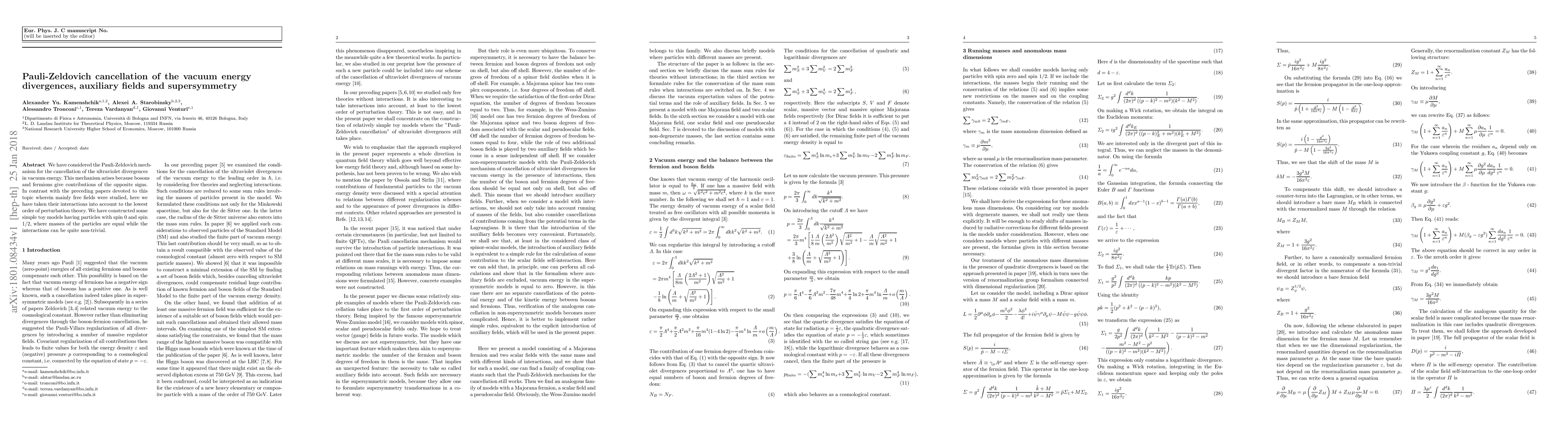 We have considered the Pauli-Zeldovich mechanism for the cancellation of the ultraviolet divergences in vacuum energy. This mechanism arises because bosons and fermions give contributions of the opposite signs. In contrast with the preceding papers devoted to this topic wherein mainly free fields were studied, here we have taken their interactions into account to the lowest order of perturbation theory. We have constructed some simple toy models having particles with spin 0 and spin 1/2, where masses of the particles are equal while the interactions can be quite non-trivial.