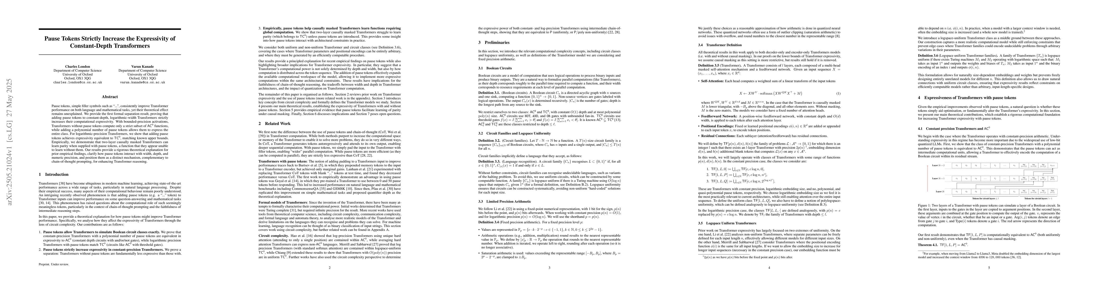 The paper presents the first formal separation result proving that pause tokens increase the expressivity of constant-depth, logarithmic-width Transformers, enabling them to compute functions beyond a strict subset of AC^0.