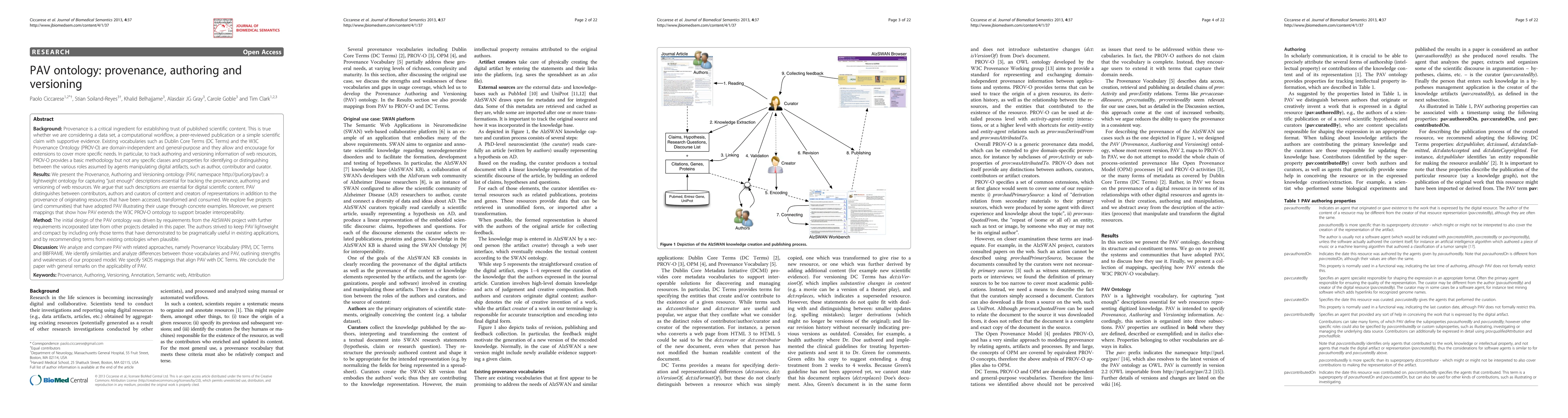 The PAV ontology aims to capture essential descriptions for tracking provenance, authoring, and versioning of web resources, distinguishing roles like authors, contributors, and curators. It extends PROV-O to enhance interoperability and has been adopted by several projects, demonstrating its practical utility.
