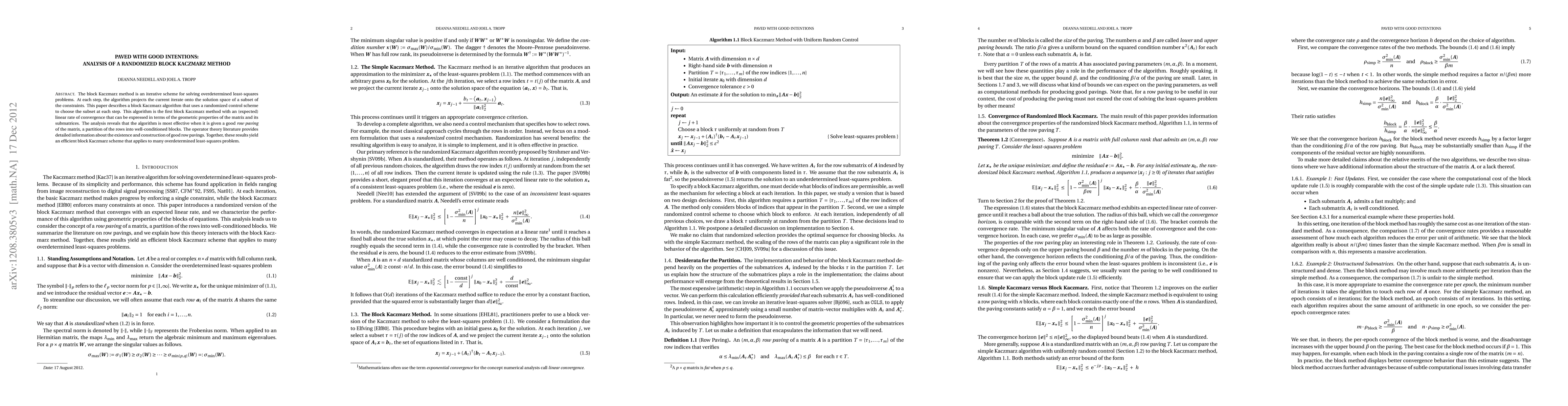 The block Kaczmarz method is an iterative scheme for solving overdetermined least-squares problems. At each step, the algorithm projects the current iterate onto the solution space of a subset of the constraints. This paper describes a block Kaczmarz algorithm that uses a randomized control scheme to choose the subset at each step. This algorithm is the first block Kaczmarz method with an (expected) linear rate of convergence that can be expressed in terms of the geometric properties of the matrix and its submatrices. The analysis reveals that the algorithm is most effective when it is given a good row paving of the matrix, a partition of the rows into well-conditioned blocks. The operator theory literature provides detailed information about the existence and construction of good row pavings. Together, these results yield an efficient block Kaczmarz scheme that applies to many overdetermined least-squares problem.