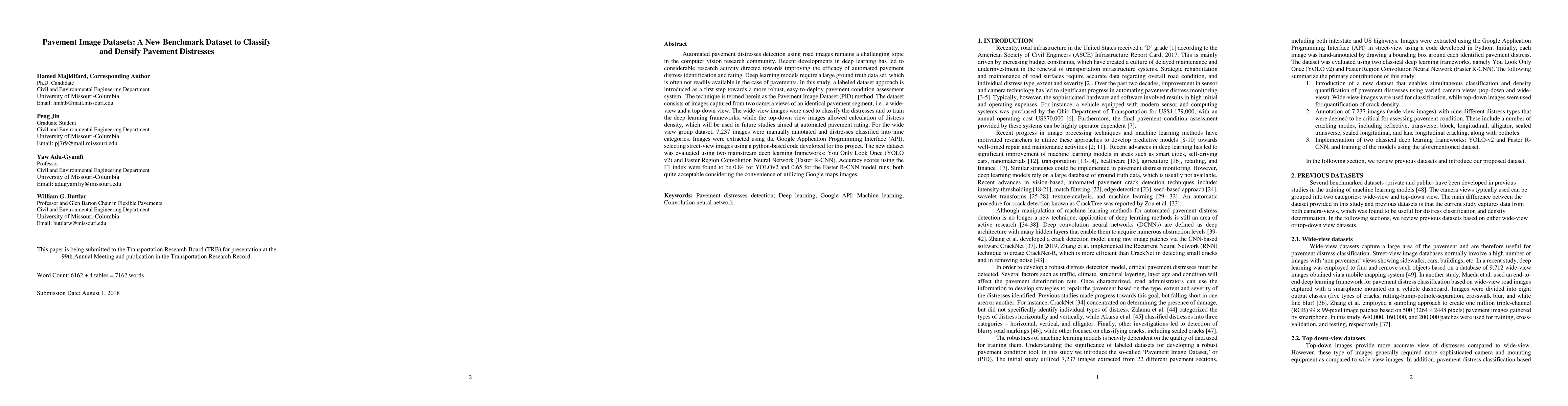 This paper introduces the Pavement Image Dataset (PID), a new benchmark for classifying and densifying pavement distresses using road images. The dataset includes 7,237 manually annotated images from two camera views, evaluated using YOLOv2 and Faster R-CNN, achieving F1 scores of 0.84 and 0.65 respectively, demonstrating the potential for automated pavement condition assessment.