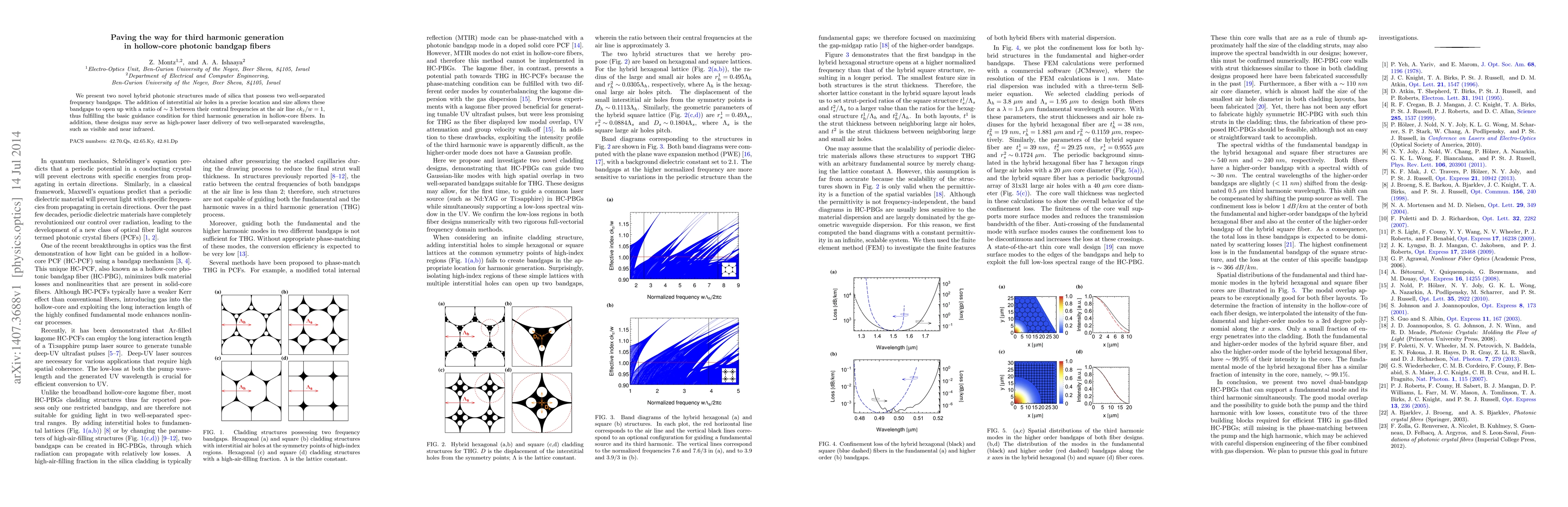 This paper introduces two novel silica-based hybrid photonic structures with precisely engineered interstitial air holes, achieving a frequency bandgap ratio of ${\sim3}$ conducive to third harmonic generation in hollow-core fibers. The designs also enable high-power laser delivery of separated visible and near-infrared wavelengths.