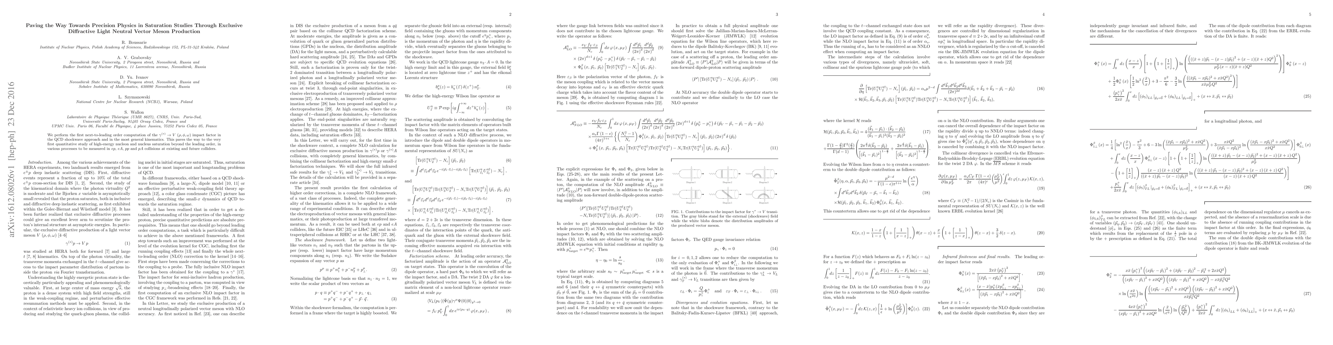 We perform the first next-to-leading order computation of the $\gamma^{(*)} \to V$ ($\rho, \phi, \omega$) impact factor in the QCD shockwave approach and in the most general kinematics. This paves the way to the very first quantitative study of high-energy nucleon and nucleus saturation beyond the leading order, in various processes to be measured in $ep$, $eA$, $pp$ and $pA$ collisions at existing and future colliders.