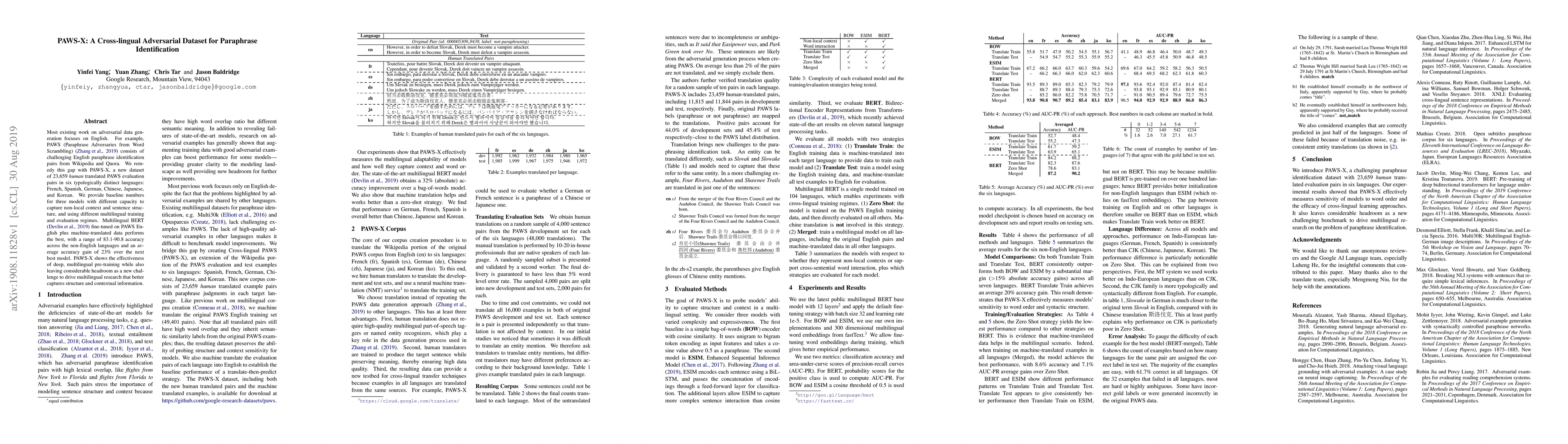 PAWS-X introduces a multilingual dataset for paraphrase identification, outperforming English-only models with 23% accuracy gain, showcasing the effectiveness of deep, multilingual pre-training.