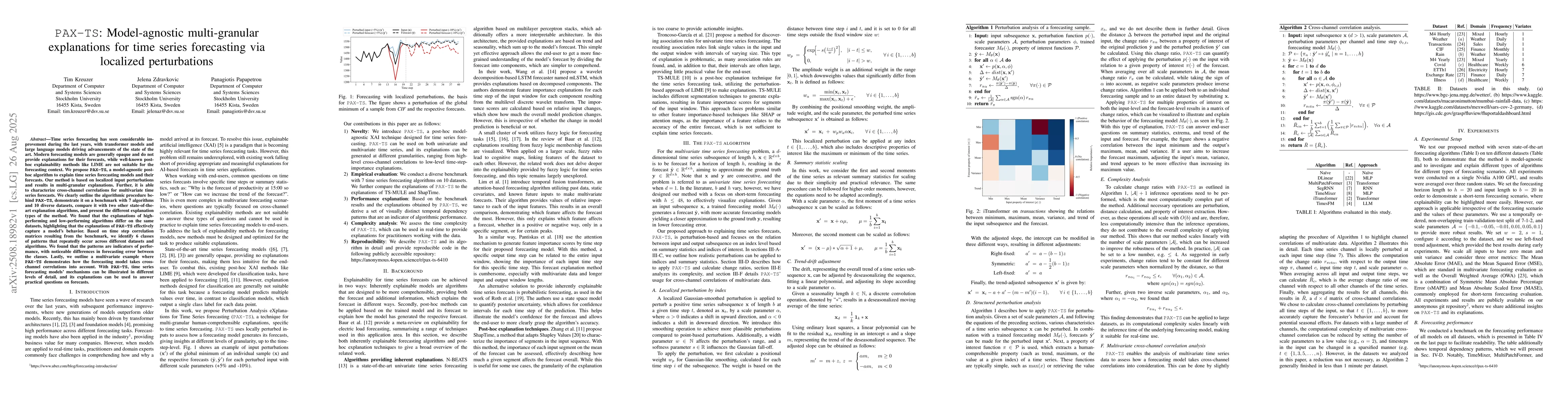 Time series forecasting has seen considerable improvement during the last years, with transformer models and large language models driving advancements of the state of the art. Modern forecasting models are generally opaque and do not provide explanations for their forecasts, while well-known post-hoc explainability methods like LIME are not suitable for the forecasting context. We propose PAX-TS, a model-agnostic post-hoc algorithm to explain time series forecasting models and their forecasts. Our method is based on localized input perturbations and results in multi-granular explanations. Further, it is able to characterize cross-channel correlations for multivariate time series forecasts. We clearly outline the algorithmic procedure behind PAX-TS, demonstrate it on a benchmark with 7 algorithms and 10 diverse datasets, compare it with two other state-of-the-art explanation algorithms, and present the different explanation types of the method. We found that the explanations of high-performing and low-performing algorithms differ on the same datasets, highlighting that the explanations of PAX-TS effectively capture a model's behavior. Based on time step correlation matrices resulting from the benchmark, we identify 6 classes of patterns that repeatedly occur across different datasets and algorithms. We found that the patterns are indicators of performance, with noticeable differences in forecasting error between the classes. Lastly, we outline a multivariate example where PAX-TS demonstrates how the forecasting model takes cross-channel correlations into account. With PAX-TS, time series forecasting models' mechanisms can be illustrated in different levels of detail, and its explanations can be used to answer practical questions on forecasts.