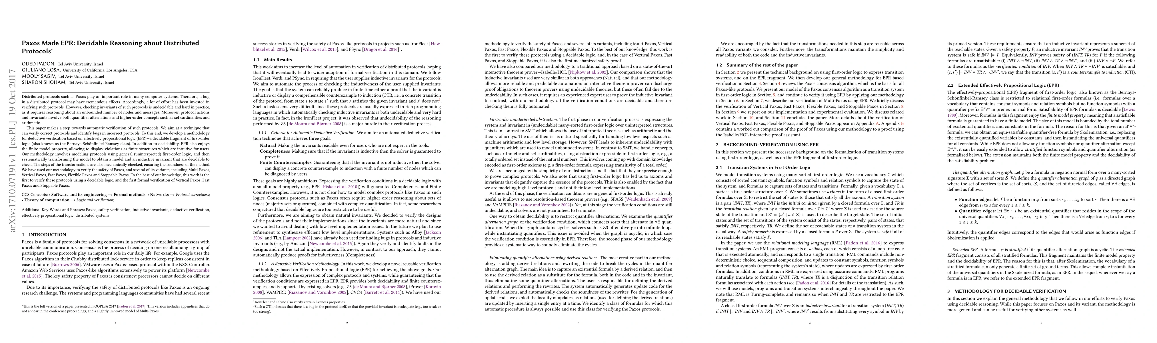 This paper proposes a methodology for verifying distributed protocols like Paxos using effectively propositional logic (EPR), a decidable fragment of first-order logic, to identify bugs and ensure correctness. The methodology transforms first-order logic models into decidable forms, enabling automatic verification and intuitive display of violations.