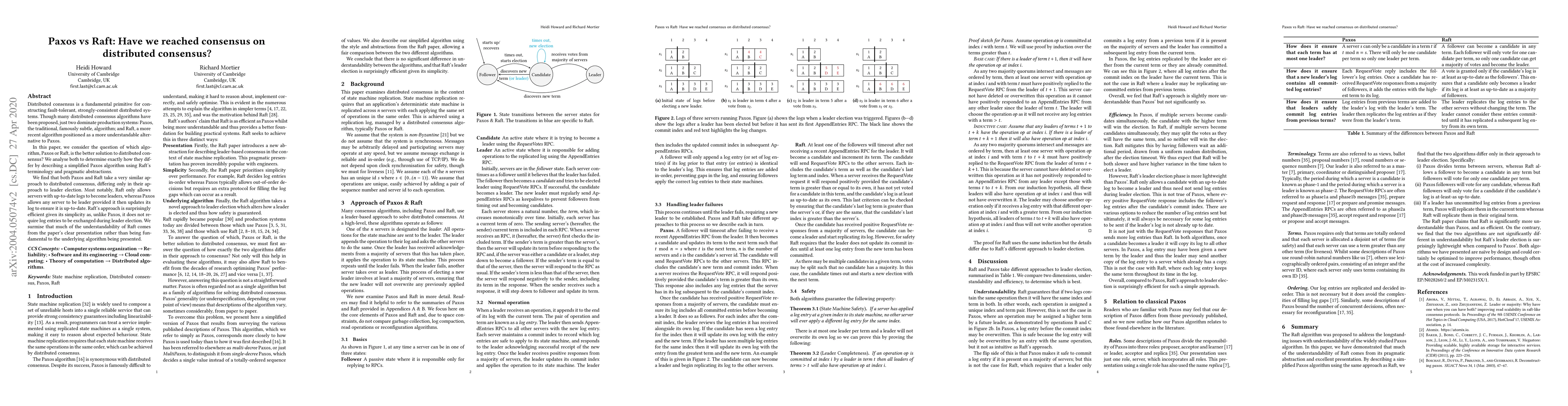 This paper compares Paxos and Raft, two leading distributed consensus algorithms, finding that while they differ mainly in leader election strategies, both fundamentally achieve similar consensus approaches. Raft's simplicity and efficiency are attributed more to its clear presentation than to inherent algorithmic advantages.