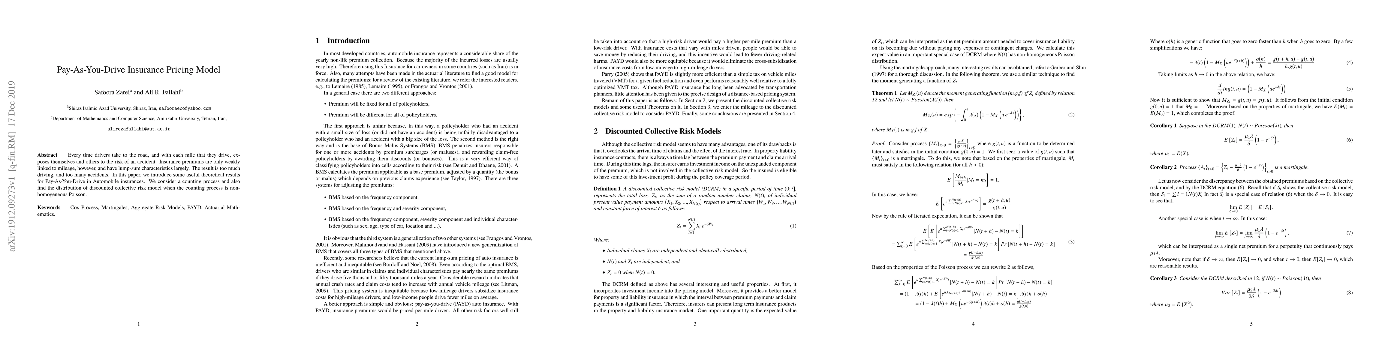 This paper proposes a Pay-As-You-Drive insurance pricing model that directly correlates premiums with mileage to reduce excessive driving and accidents. It uses a non-homogeneous Poisson counting process to determine the distribution of a discounted collective risk model.