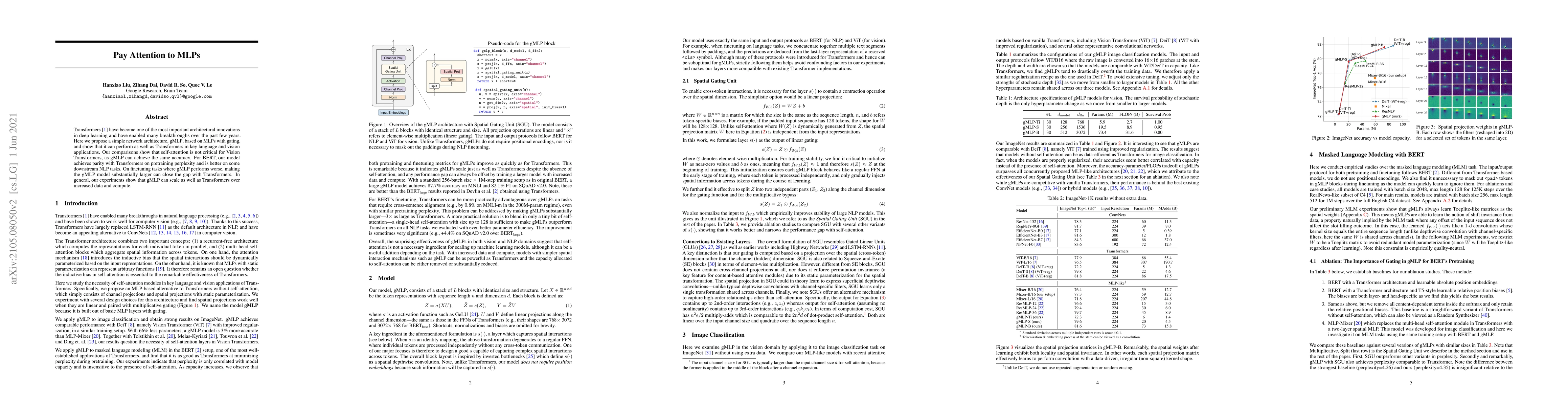 Transformers have become one of the most important architectural innovations in deep learning and have enabled many breakthroughs over the past few years. Here we propose a simple network architecture, gMLP, based on MLPs with gating, and show that it can perform as well as Transformers in key language and vision applications. Our comparisons show that self-attention is not critical for Vision Transformers, as gMLP can achieve the same accuracy. For BERT, our model achieves parity with Transformers on pretraining perplexity and is better on some downstream NLP tasks. On finetuning tasks where gMLP performs worse, making the gMLP model substantially larger can close the gap with Transformers. In general, our experiments show that gMLP can scale as well as Transformers over increased data and compute.