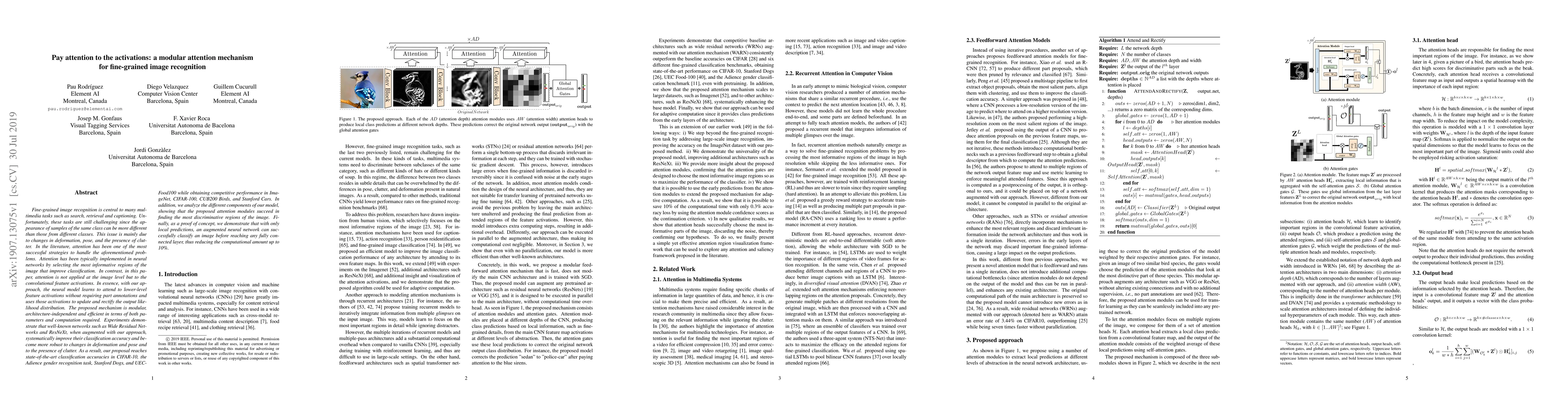 This paper proposes a modular attention mechanism that focuses on convolutional feature activations to improve fine-grained image recognition, achieving state-of-the-art classification accuracies across several datasets while reducing computational load. The attention mechanism enhances network robustness and accuracy without requiring part annotations.
