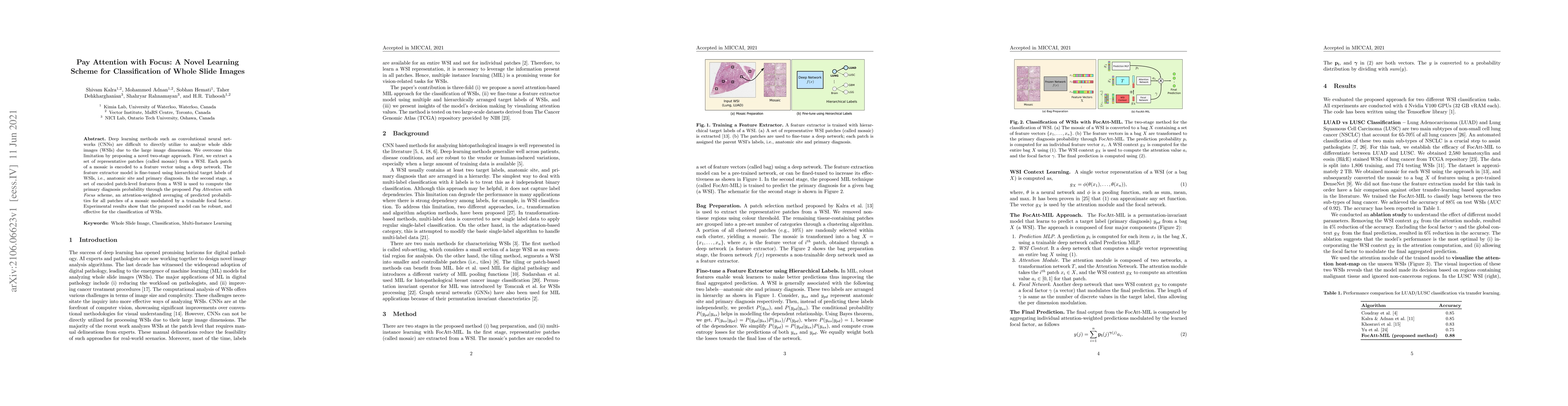 Deep learning methods such as convolutional neural networks (CNNs) are difficult to directly utilize to analyze whole slide images (WSIs) due to the large image dimensions. We overcome this limitation by proposing a novel two-stage approach. First, we extract a set of representative patches (called mosaic) from a WSI. Each patch of a mosaic is encoded to a feature vector using a deep network. The feature extractor model is fine-tuned using hierarchical target labels of WSIs, i.e., anatomic site and primary diagnosis. In the second stage, a set of encoded patch-level features from a WSI is used to compute the primary diagnosis probability through the proposed Pay Attention with Focus scheme, an attention-weighted averaging of predicted probabilities for all patches of a mosaic modulated by a trainable focal factor. Experimental results show that the proposed model can be robust, and effective for the classification of WSIs.