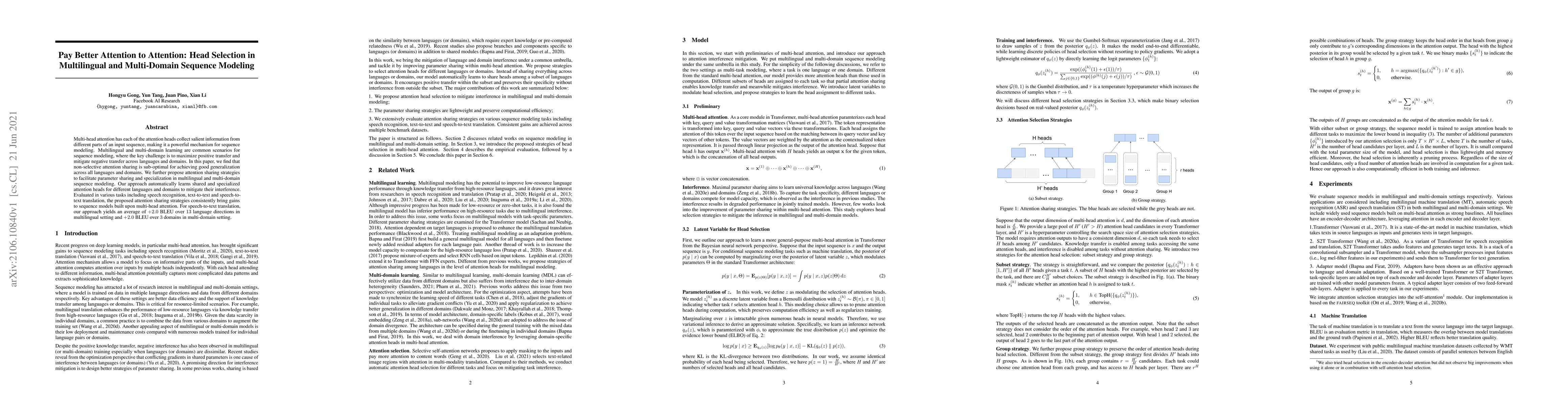 Multi-head attention has each of the attention heads collect salient information from different parts of an input sequence, making it a powerful mechanism for sequence modeling. Multilingual and multi-domain learning are common scenarios for sequence modeling, where the key challenge is to maximize positive transfer and mitigate negative transfer across languages and domains. In this paper, we find that non-selective attention sharing is sub-optimal for achieving good generalization across all languages and domains. We further propose attention sharing strategies to facilitate parameter sharing and specialization in multilingual and multi-domain sequence modeling. Our approach automatically learns shared and specialized attention heads for different languages and domains to mitigate their interference. Evaluated in various tasks including speech recognition, text-to-text and speech-to-text translation, the proposed attention sharing strategies consistently bring gains to sequence models built upon multi-head attention. For speech-to-text translation, our approach yields an average of $+2.0$ BLEU over $13$ language directions in multilingual setting and $+2.0$ BLEU over $3$ domains in multi-domain setting.