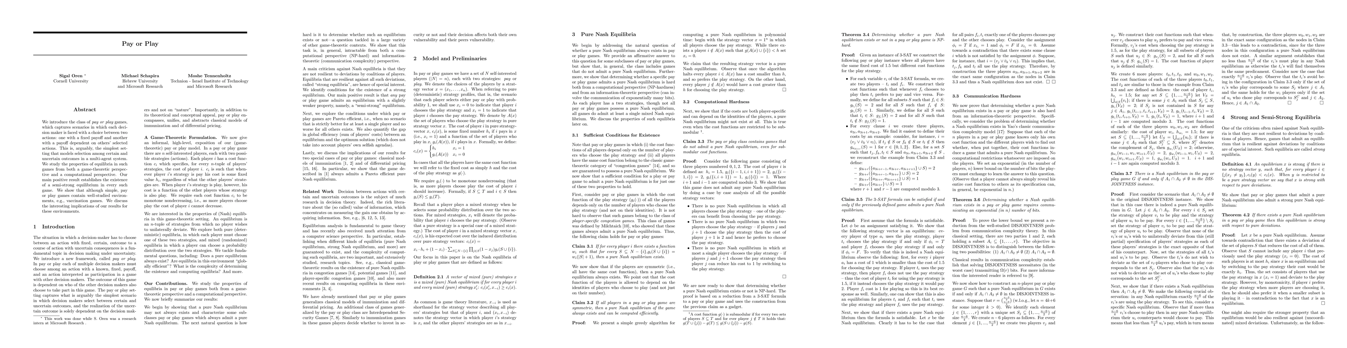 This paper introduces pay or play games, where each player chooses between a certain and an uncertain payoff, and studies their equilibria. It establishes the existence of a semi-strong equilibrium in these games and discusses their implications for environments like vaccination games.