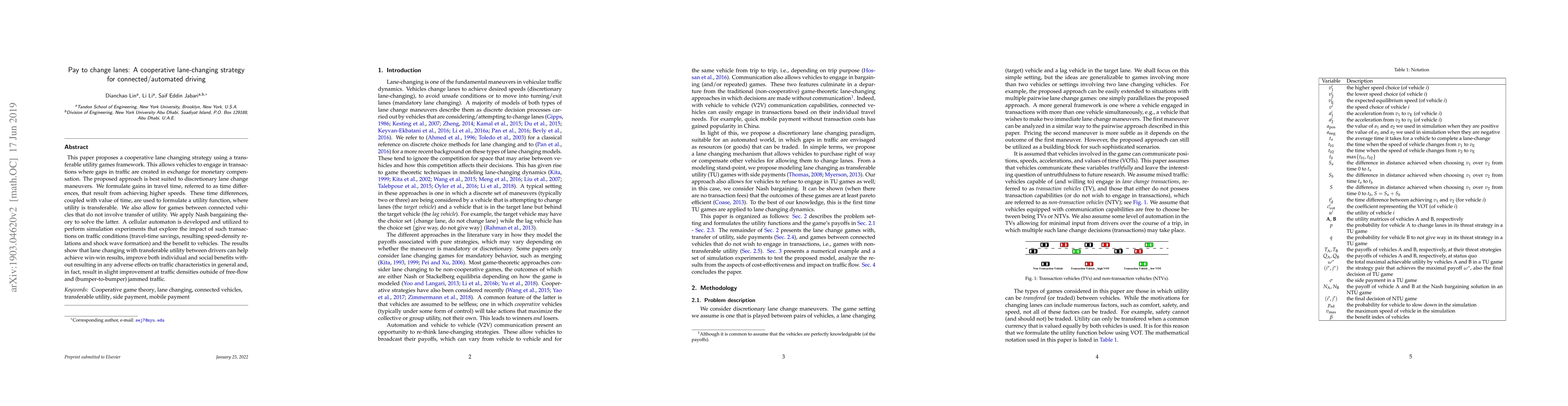 This paper proposes a cooperative lane changing strategy using a transferable utility games framework. This allows vehicles to engage in transactions where gaps in traffic are created in exchange for monetary compensation. The proposed approach is best suited to discretionary lane change maneuvers. We formulate gains in travel time, referred to as time differences, that result from achieving higher speeds. These time differences, coupled with value of time, are used to formulate a utility function, where utility is transferable. We also allow for games between connected vehicles that do not involve transfer of utility. We apply Nash bargaining theory to solve the latter. A cellular automaton is developed and utilized to perform simulation experiments that explore the impact of such transactions on traffic conditions (travel-time savings, resulting speed-density relations and shock wave formation) and the benefit to vehicles. The results show that lane changing with transferable utility between drivers can help achieve win-win results, improve both individual and social benefits without resulting in any adverse effects on traffic characteristics in general and, in fact, result in slight improvement at traffic densities outside of free-flow and (bumper-to-bumper) jammed traffic.
