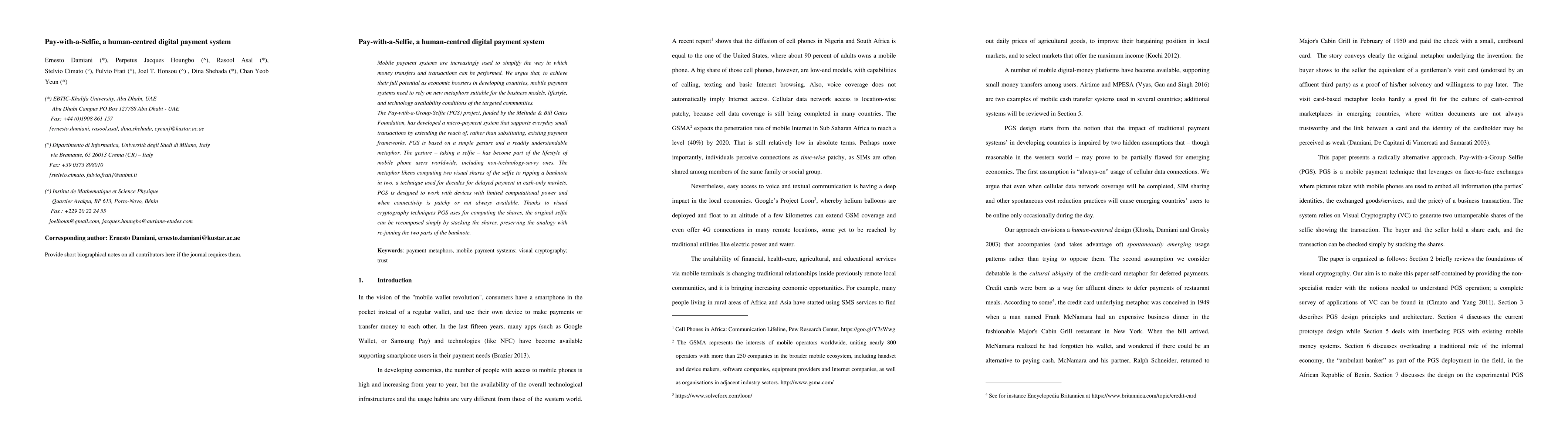 The Pay-with-a-Group-Selfie (PGS) project introduces a human-centred mobile payment system leveraging selfies to facilitate small transactions in developing countries, using visual cryptography to split and recompose selfies as a metaphor for delayed payment. PGS aims to extend existing payment frameworks with minimal computational requirements and connectivity issues in mind.