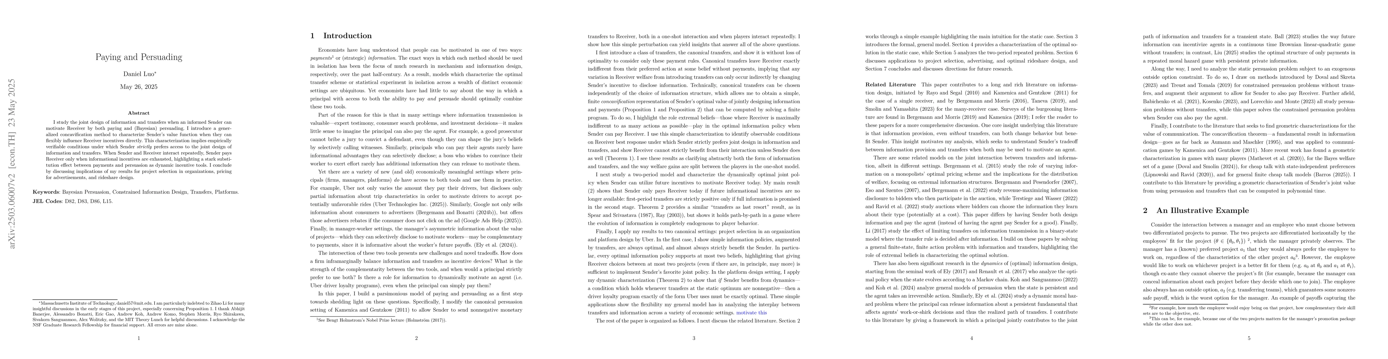 We study the joint design of information and transfers when an informed Sender can motivate Receiver by both paying and (Bayesian) persuading. We introduce an augmented concavification method to characterize Sender's value from jointly designing information and transfers. We use this characterization to show Sender strictly benefits from combining information and payments whenever the actions induced at adjacent kinks in the augmented concavification differ from those in the information-only concavification. When Receiver has an outside option, Sender always first increases the informativeness of their experiment before adjusting transfers - payments change if and only if full revelation does not meet Receiver's outside option constraint. Moreover, we show repeated interactions cannot restore ex-post efficiency, even with transfers and arbitrarily patient agents. However, Sender benefits from linking incentives so long as Receiver prefers the stage-game optimal information structure to no information. Our results have implications for platforms such as Uber, where both monetary rewards and strategic information disclosure influence driver behavior.