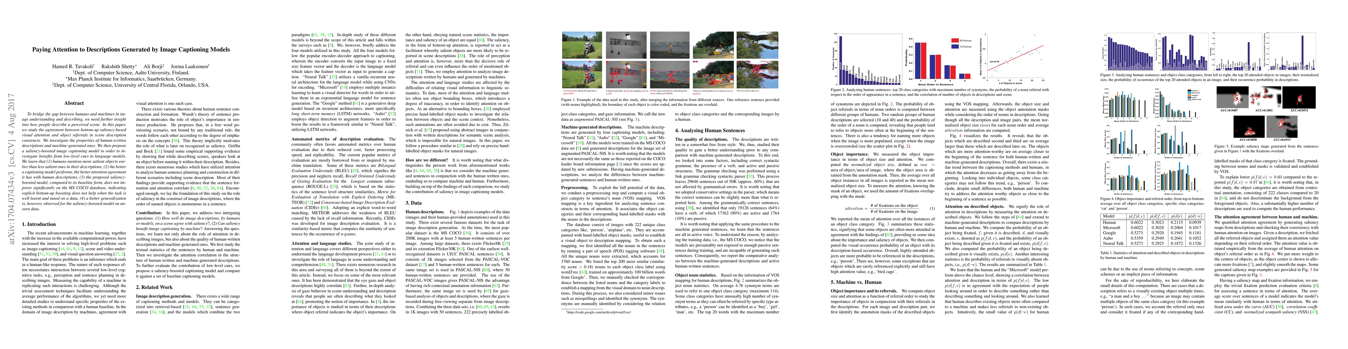This study investigates the relationship between human and machine image descriptions, revealing that humans prioritize salient objects. A saliency-boosted captioning model shows limited improvement on trained datasets but better generalization on unseen data.