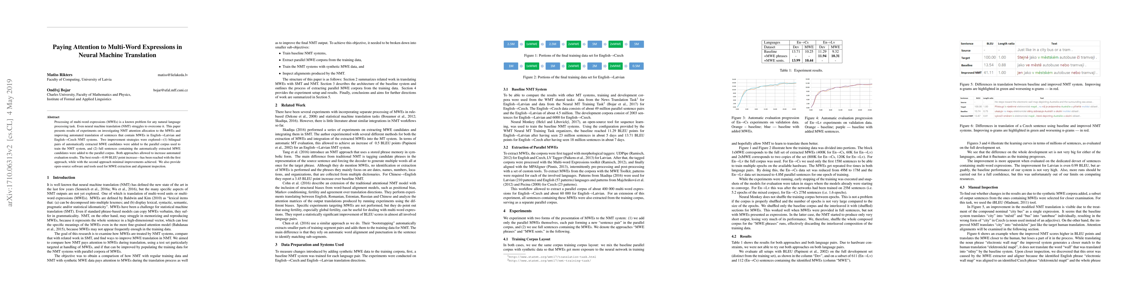 Processing of multi-word expressions (MWEs) is a known problem for any natural language processing task. Even neural machine translation (NMT) struggles to overcome it. This paper presents results of experiments on investigating NMT attention allocation to the MWEs and improving automated translation of sentences that contain MWEs in English->Latvian and English->Czech NMT systems. Two improvement strategies were explored -(1) bilingual pairs of automatically extracted MWE candidates were added to the parallel corpus used to train the NMT system, and (2) full sentences containing the automatically extracted MWE candidates were added to the parallel corpus. Both approaches allowed to increase automated evaluation results. The best result - 0.99 BLEU point increase - has been reached with the first approach, while with the second approach minimal improvements achieved. We also provide open-source software and tools used for MWE extraction and alignment inspection.