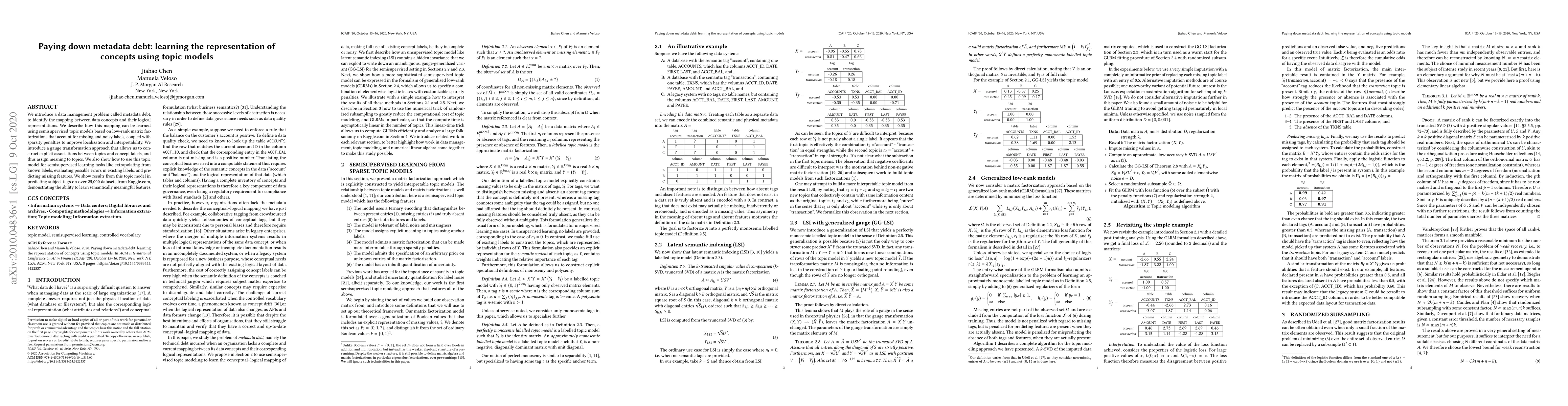 This paper addresses metadata debt by mapping data concepts to their logical representations using semisupervised topic models. It introduces a gauge transformation to assign meaning to topics and demonstrates the model's effectiveness in semisupervised learning tasks through experiments on Kaggle datasets.