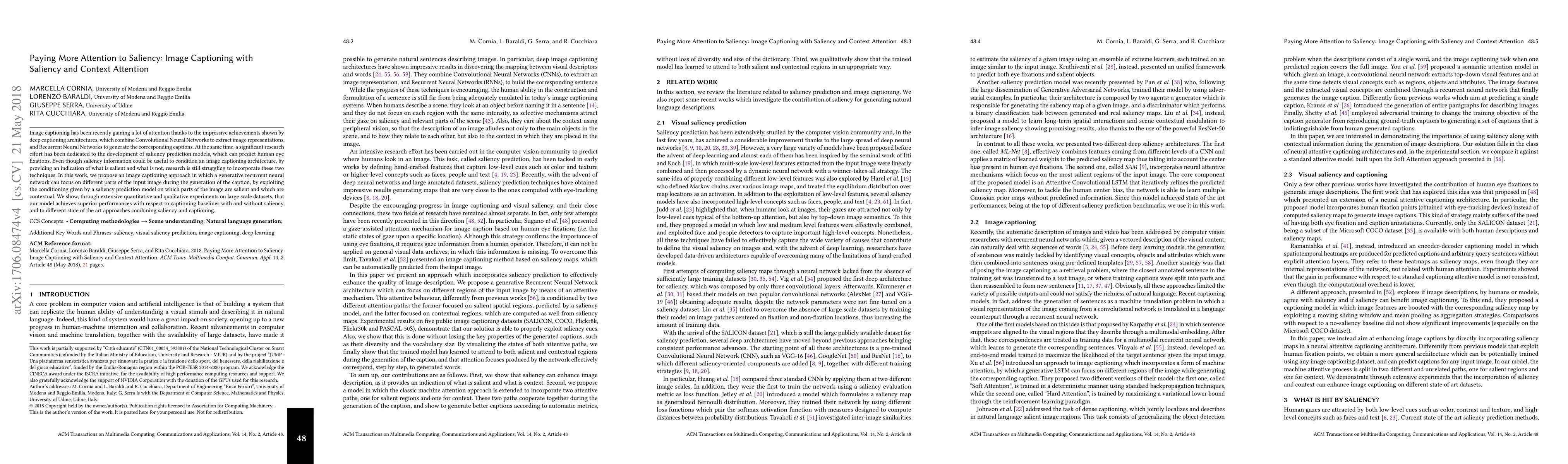 Image captioning has been recently gaining a lot of attention thanks to the impressive achievements shown by deep captioning architectures, which combine Convolutional Neural Networks to extract image representations, and Recurrent Neural Networks to generate the corresponding captions. At the same time, a significant research effort has been dedicated to the development of saliency prediction models, which can predict human eye fixations. Even though saliency information could be useful to condition an image captioning architecture, by providing an indication of what is salient and what is not, research is still struggling to incorporate these two techniques. In this work, we propose an image captioning approach in which a generative recurrent neural network can focus on different parts of the input image during the generation of the caption, by exploiting the conditioning given by a saliency prediction model on which parts of the image are salient and which are contextual. We show, through extensive quantitative and qualitative experiments on large scale datasets, that our model achieves superior performances with respect to captioning baselines with and without saliency, and to different state of the art approaches combining saliency and captioning.