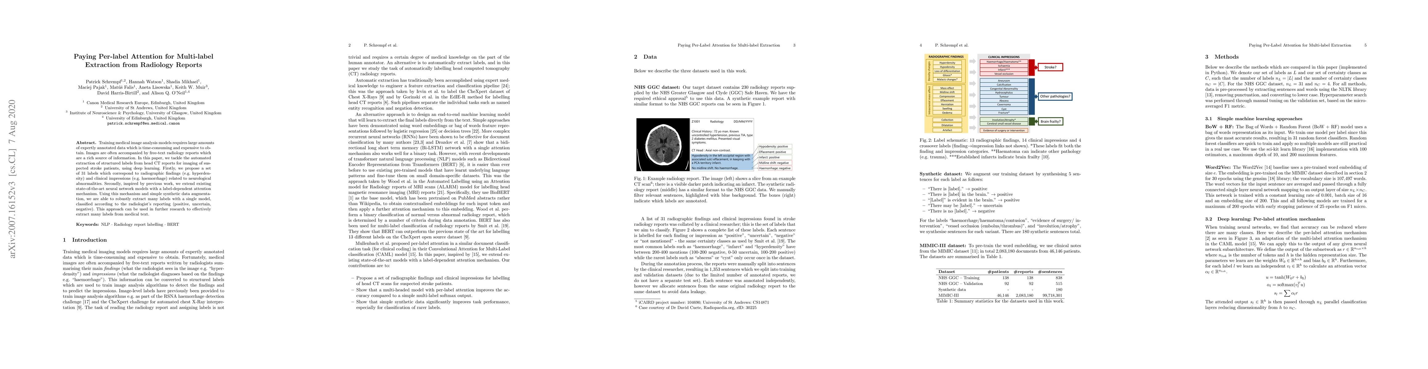 Training medical image analysis models requires large amounts of expertly annotated data which is time-consuming and expensive to obtain. Images are often accompanied by free-text radiology reports which are a rich source of information. In this paper, we tackle the automated extraction of structured labels from head CT reports for imaging of suspected stroke patients, using deep learning. Firstly, we propose a set of 31 labels which correspond to radiographic findings (e.g. hyperdensity) and clinical impressions (e.g. haemorrhage) related to neurological abnormalities. Secondly, inspired by previous work, we extend existing state-of-the-art neural network models with a label-dependent attention mechanism. Using this mechanism and simple synthetic data augmentation, we are able to robustly extract many labels with a single model, classified according to the radiologist's reporting (positive, uncertain, negative). This approach can be used in further research to effectively extract many labels from medical text.