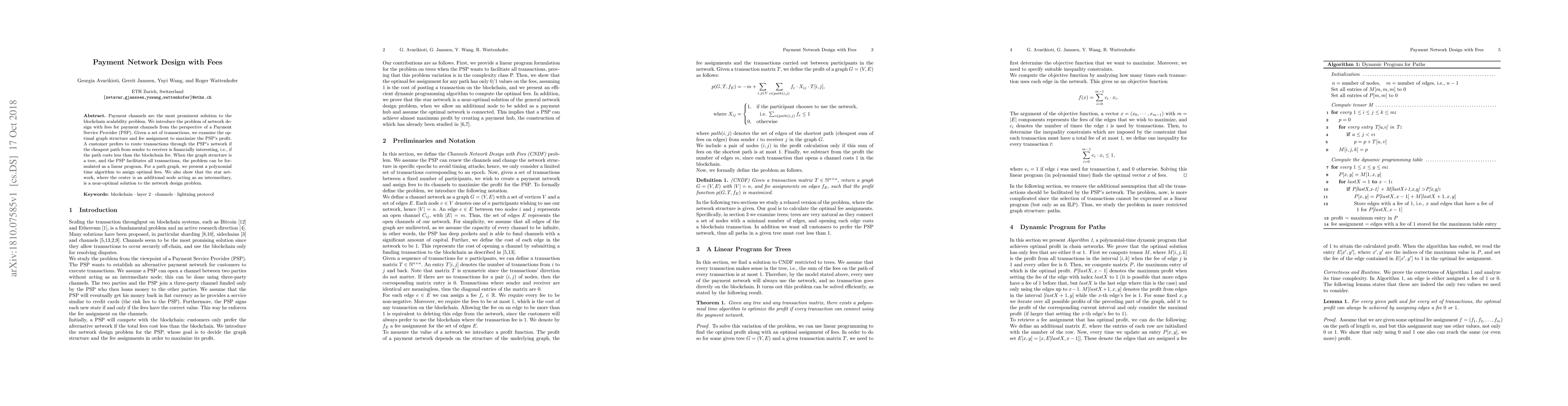 The paper formulates the payment network design problem with fees as a linear program for tree structures and presents a polynomial-time dynamic program for path graphs.
