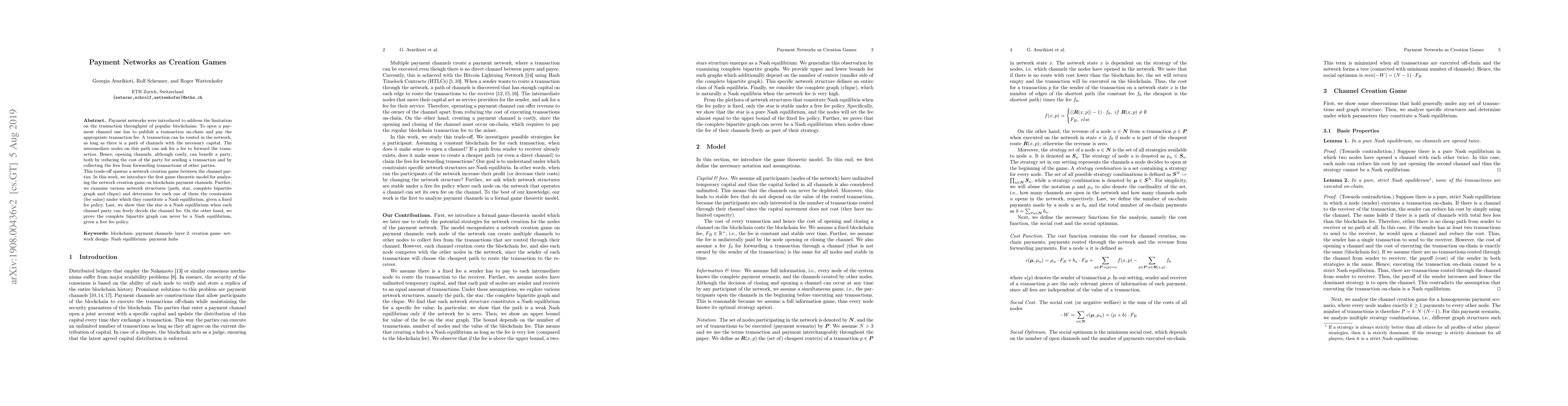 Payment networks were introduced to address the limitation on the transaction throughput of popular blockchains. To open a payment channel one has to publish a transaction on-chain and pay the appropriate transaction fee. A transaction can be routed in the network, as long as there is a path of channels with the necessary capital. The intermediate nodes on this path can ask for a fee to forward the transaction. Hence, opening channels, although costly, can benefit a party, both by reducing the cost of the party for sending a transaction and by collecting the fees from forwarding transactions of other parties. This trade-off spawns a network creation game between the channel parties. In this work, we introduce the first game theoretic model for analyzing the network creation game on blockchain payment channels. Further, we examine various network structures (path, star, complete bipartite graph and clique) and determine for each one of them the constraints (fee value) under which they constitute a Nash equilibrium, given a fixed fee policy. Last, we show that the star is a Nash equilibrium when each channel party can freely decide the channel fee. On the other hand, we prove the complete bipartite graph can never be a Nash equilibrium, given a free fee policy.