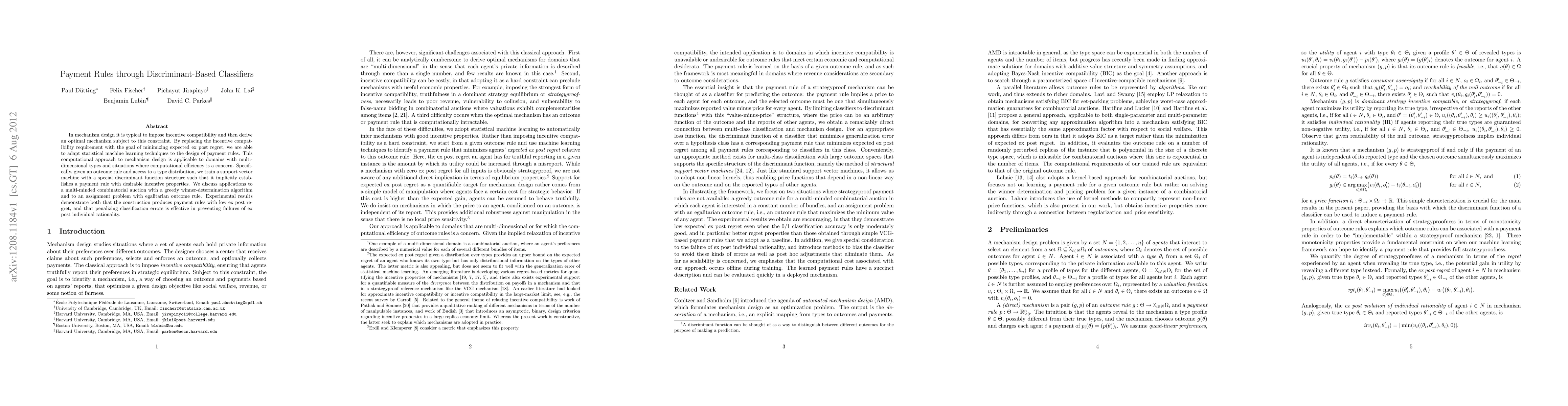 This paper proposes using discriminant-based classifiers, specifically support vector machines, to design payment rules in mechanism design by minimizing expected ex post regret instead of traditional incentive compatibility. Experimental results show effective payment rules in combinatorial auctions and assignment problems.