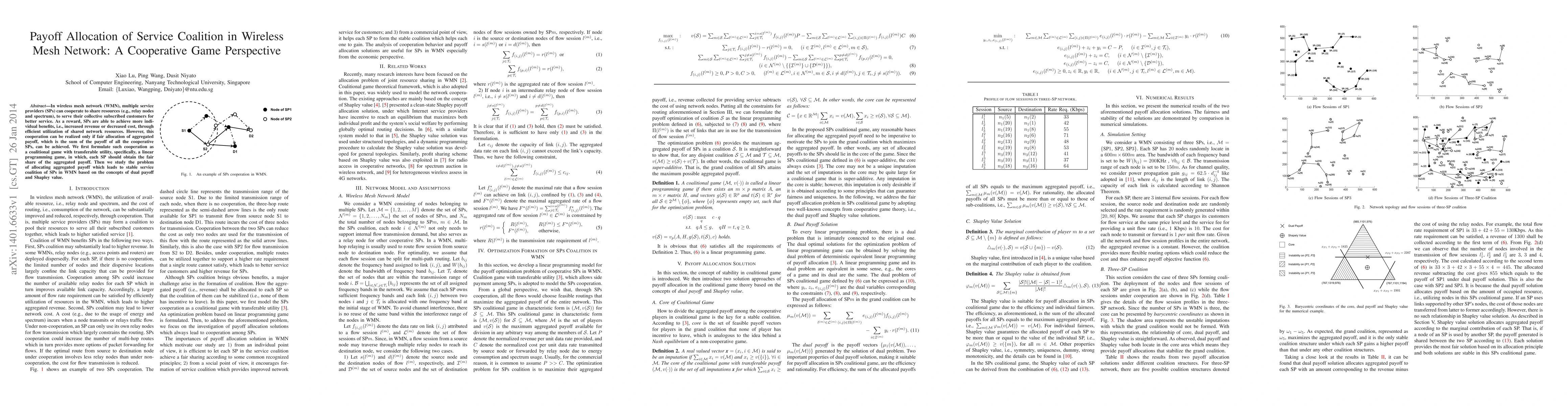 This paper proposes a cooperative game framework for allocating payoffs among service providers in a wireless mesh network. It formulates the cooperation as a linear programming game and explores fair payoff allocation using dual payoff and Shapley value concepts to ensure stable service coalitions.
