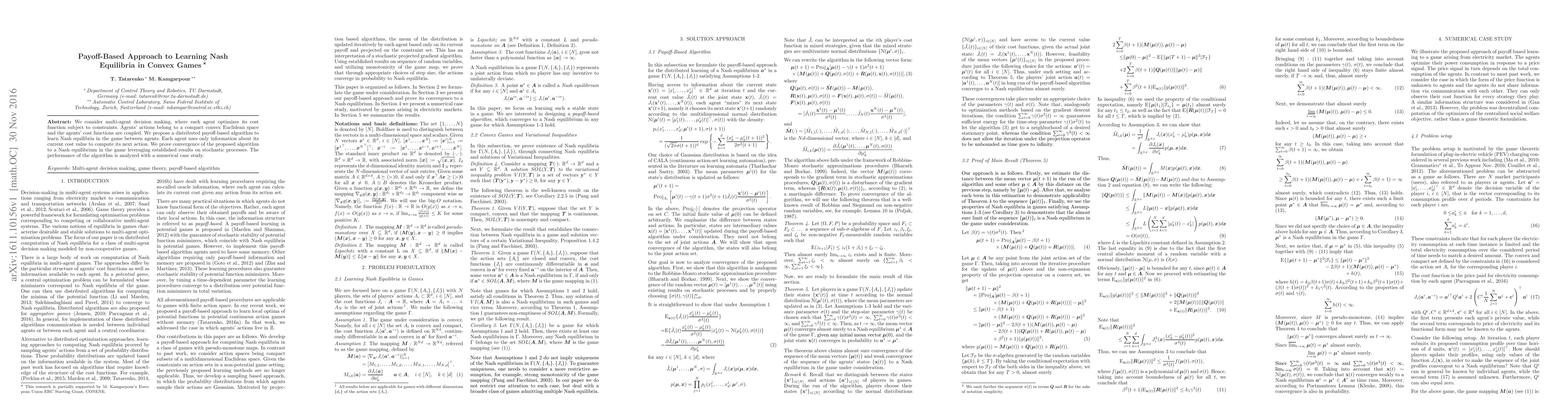We consider multi-agent decision making, where each agent optimizes its cost function subject to constraints. Agents' actions belong to a compact convex Euclidean space and the agents' cost functions are coupled. We propose a distributed payoff-based algorithm to learn Nash equilibria in the game between agents. Each agent uses only information about its current cost value to compute its next action. We prove convergence of the proposed algorithm to a Nash equilibrium in the game leveraging established results on stochastic processes. The performance of the algorithm is analyzed with a numerical case study.