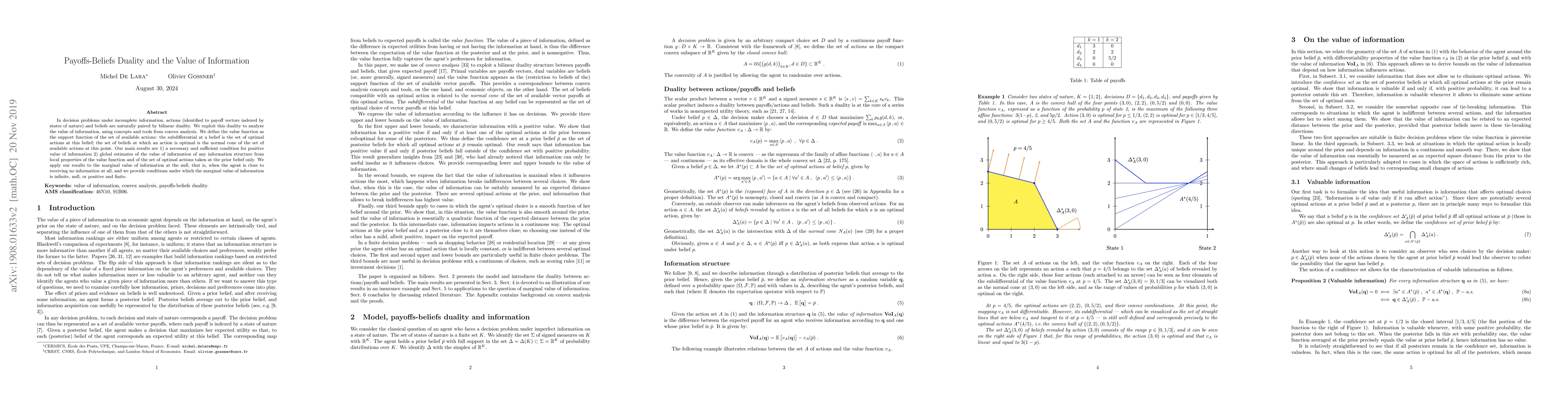 In decision problems under incomplete information, actions (identified to payoff vectors indexed by states of nature) and beliefs are naturally paired by bilinear duality. We exploit this duality to analyze the value of information, using concepts and tools from convex analysis. We define the value function as the support function of the set of available actions: the subdifferential at a belief is the set of optimal actions at this belief; the set of beliefs at which an action is optimal is the normal cone of the set of available actions at this point. Our main results are 1) a necessary and sufficient condition for positive value of information 2) global estimates of the value of information of any information structure from local properties of the value function and of the set of optimal actions taken at the prior belief only. We apply our results to the marginal value of information at the null, that is, when the agent is close to receiving no information at all, and we provide conditions under which the marginal value of information is infinite, null, or positive and finite.